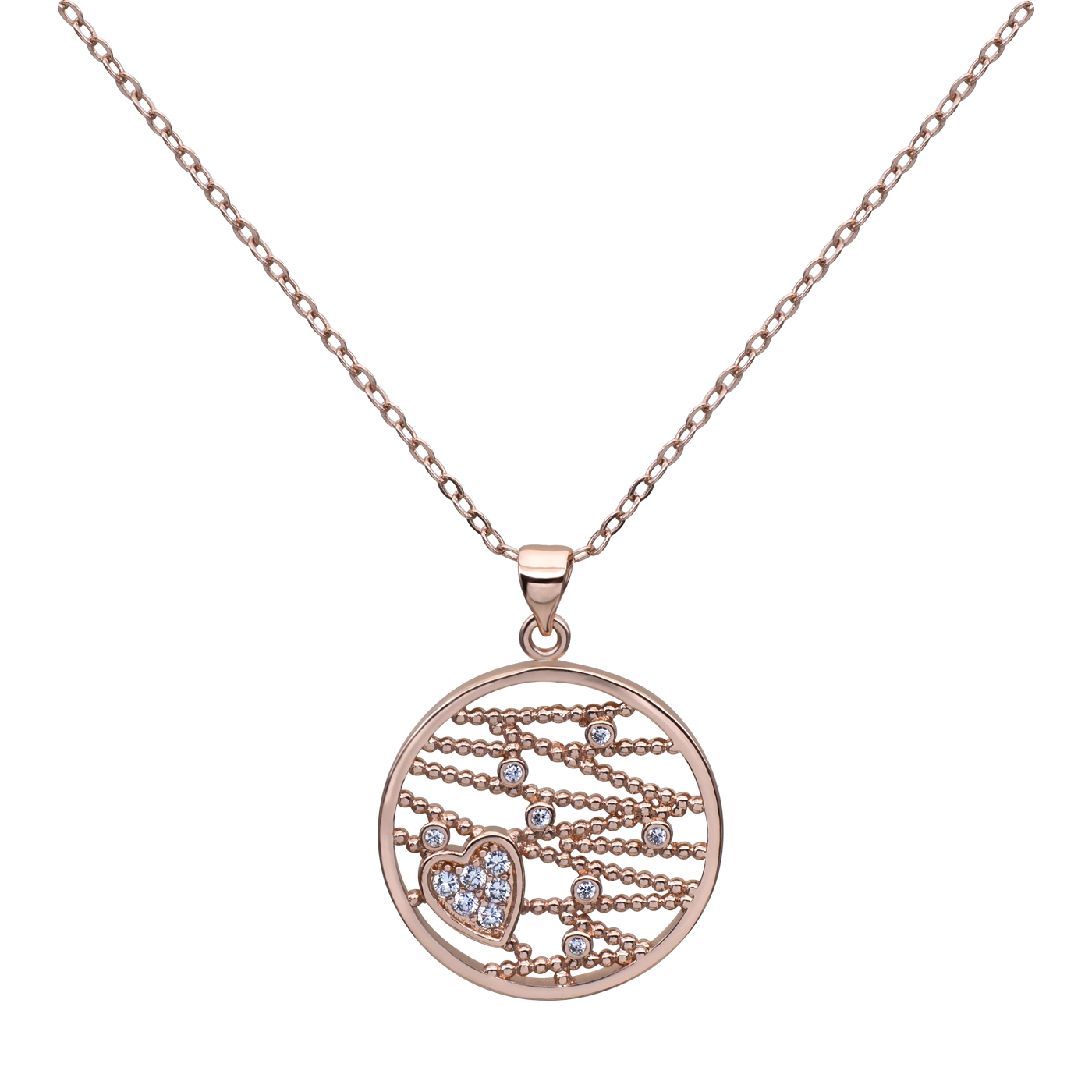 Dije con cadena en baño de oro rosa de 18 quilates, fino diseño de círculo con corazón, cuentas de cristal rosa e incrustaciones de cristales en color blanco. Fabricado en una estructura de aleación de platino con rodio sin níquel.