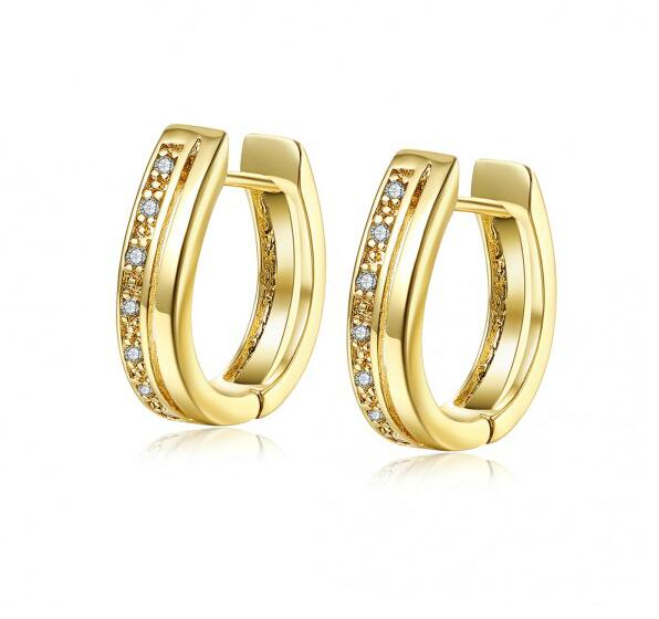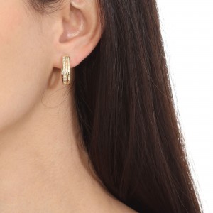 Lindas arracadas en baño de oro amarillo de 18 quilates, fino diseño con incrustaciones de cristales en color blanco. Fabricado en una estructura de aleación de platino con rodio sin níquel.