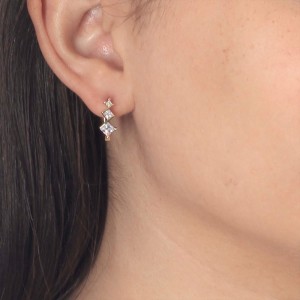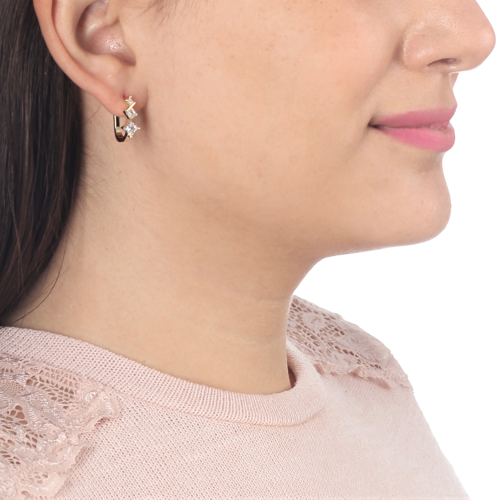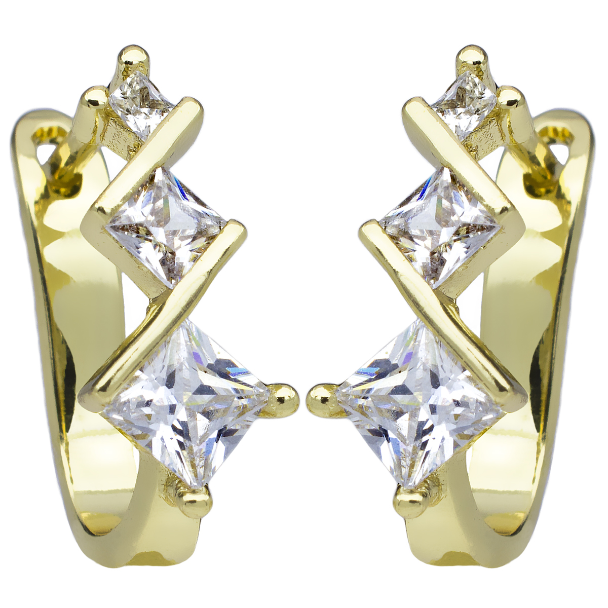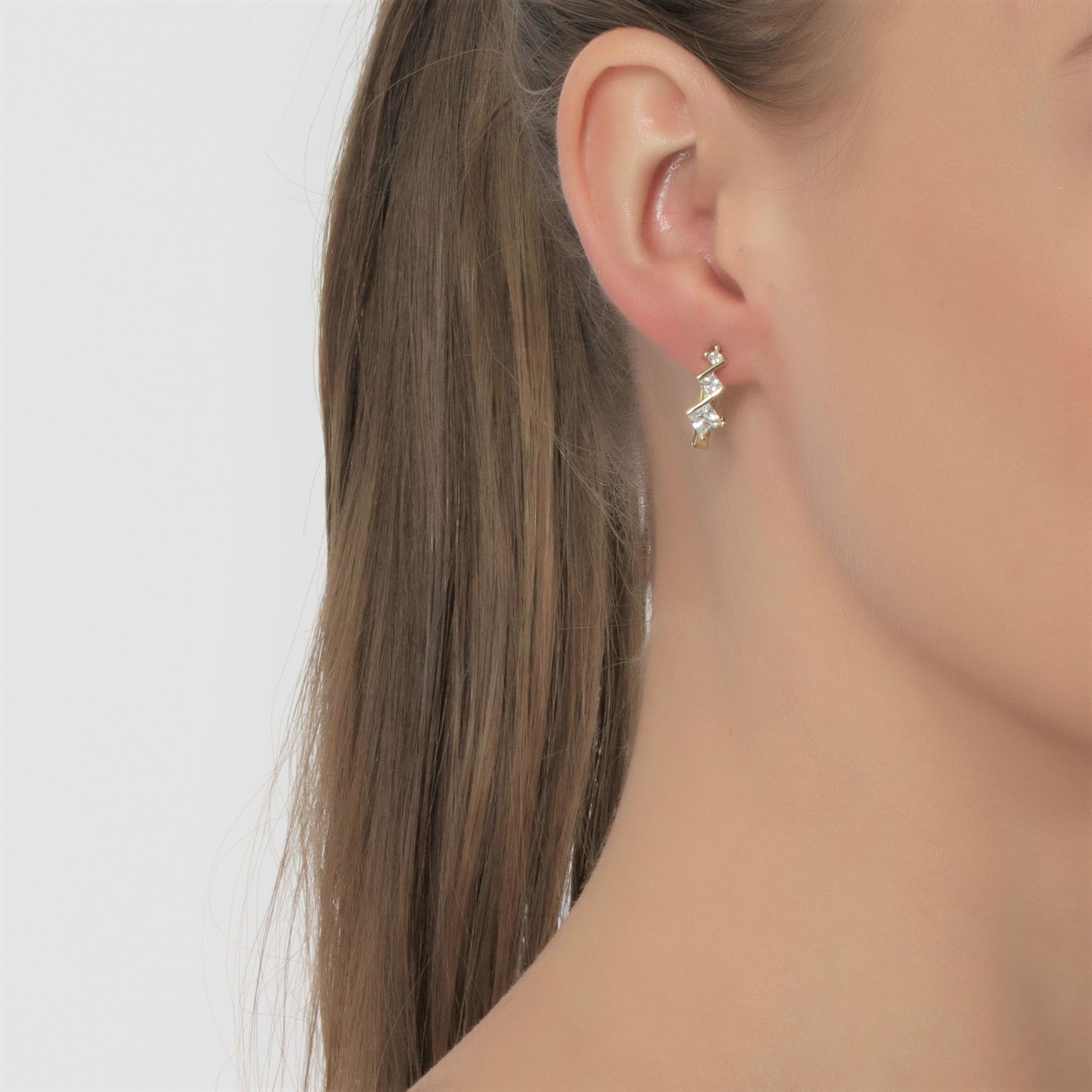 Aretes en baño de oro amarillo de 18 quilates, fino diseño zig-zag con incrustaciones de cristales en color blanco. Fabricado en una estructura de aleación de platino con rodio sin níquel.