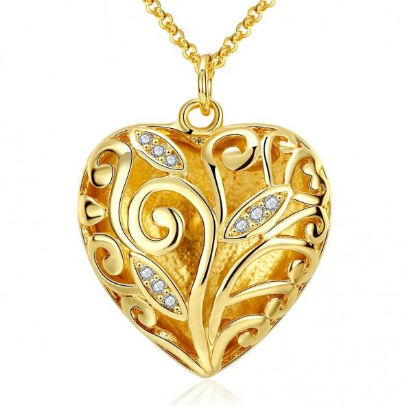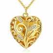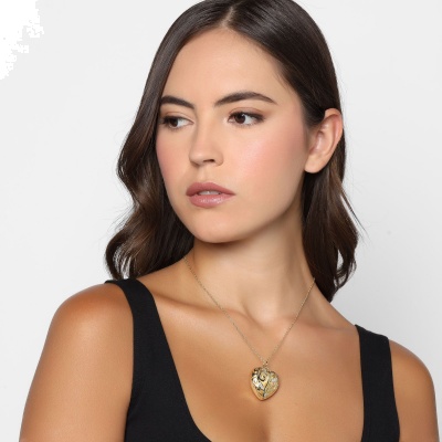 Dije con cadena en baño de oro amarillo de 18 quilates, diseño de corazón estilo calado con incrustaciones de cristales en color blanco. Fabricado en una estructura de aleación de platino con rodio sin níquel.