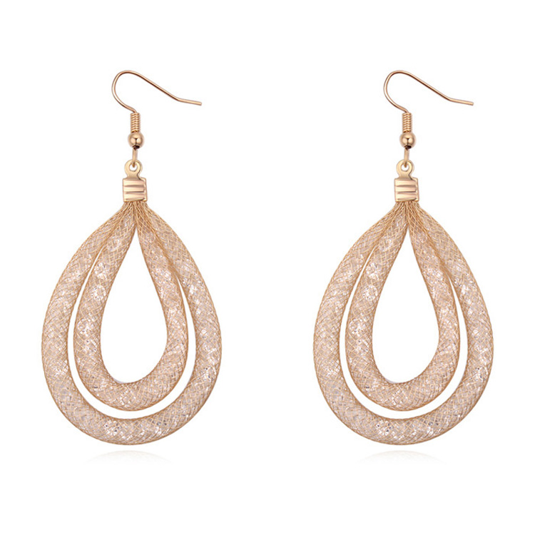 Aretes en baño de oro amarillo de 18 quilates, diseño de gota, tubo de red con cristales en color blanco. Fabricado en una estructura de aleación de platino con rodio sin níquel.