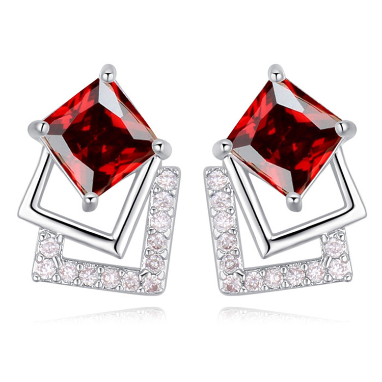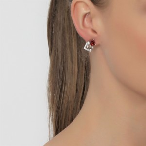 Aretes en baño de oro blanco de 18 quilates, con cristal rojo corte princesa e incrustaciones de cristales en color blanco. Fabricado en una estructura de aleación de platino con rodio sin níquel.