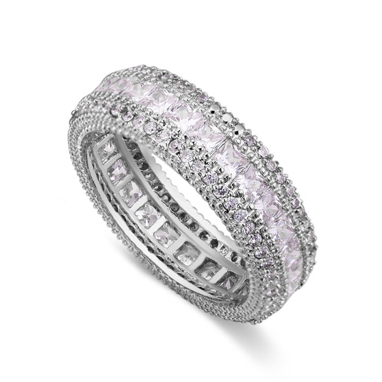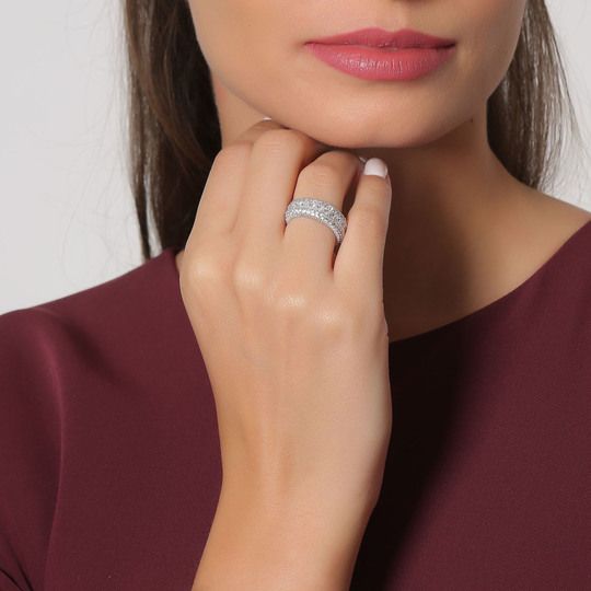 Anillo en baño de oro blanco de 18 quilates, elegante diseño con incrustaciones y chispas de cristales en color blanco. Fabricado en una estructura de aleación de platino con rodio sin níquel.