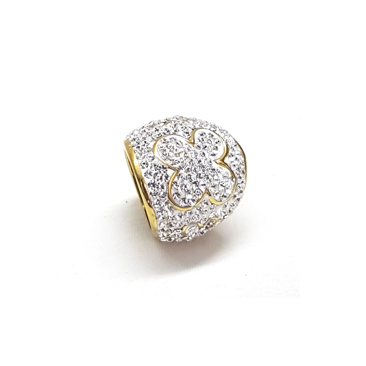 Delicado anillo en baño de oro blanco de 18 quilates, diseño estilo convexo, con detalles de flores, fondo blanco e incrustaciones de cristales blancos. Fabricado en una estructura de aleación de platino con rodio sin níquel.