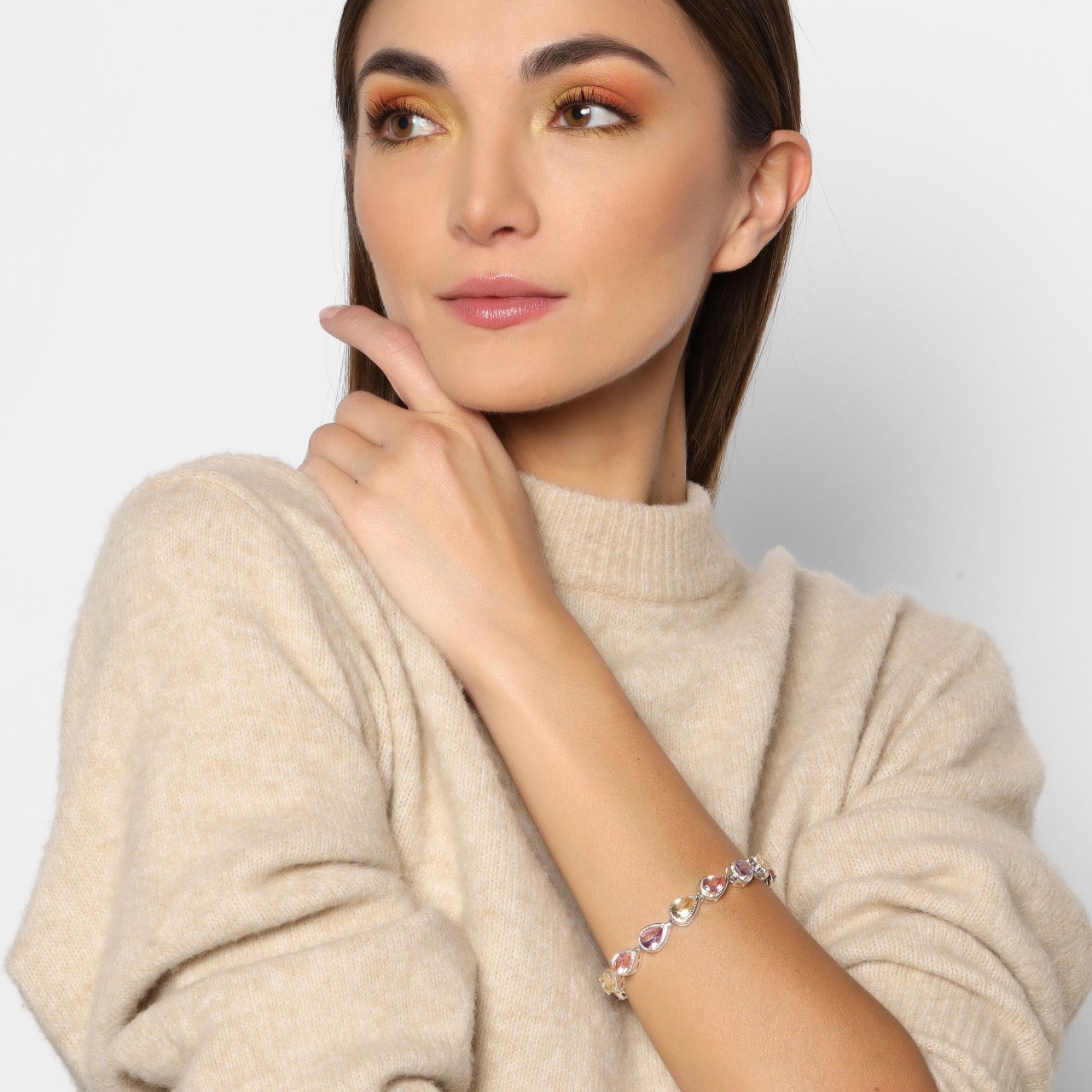 Pulsera en baño de oro blanco de 18 quilates , diseño de gota con incrustaciones de cristales en colores. Fabricado en una estructura de aleación de platino con rodio sin níquel.