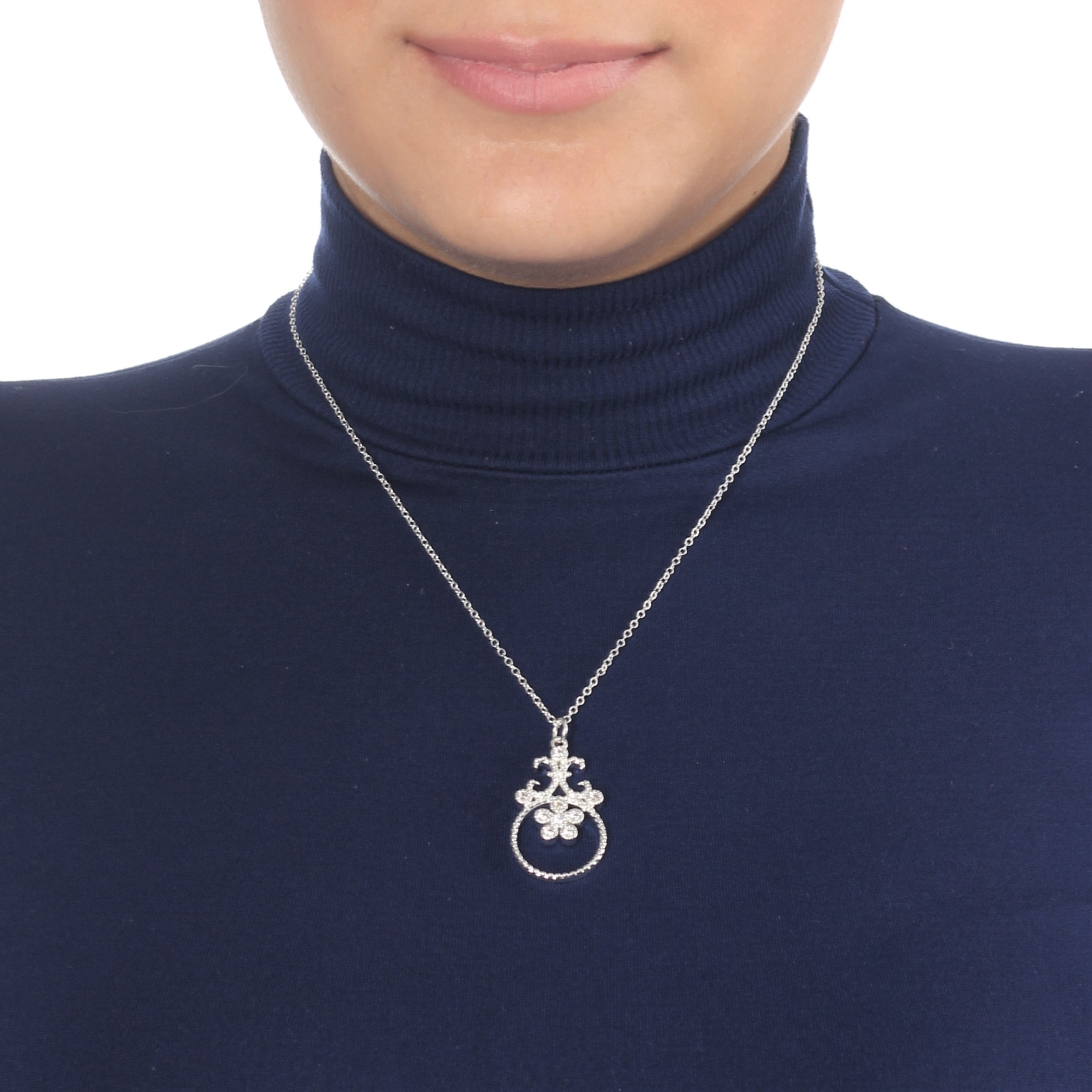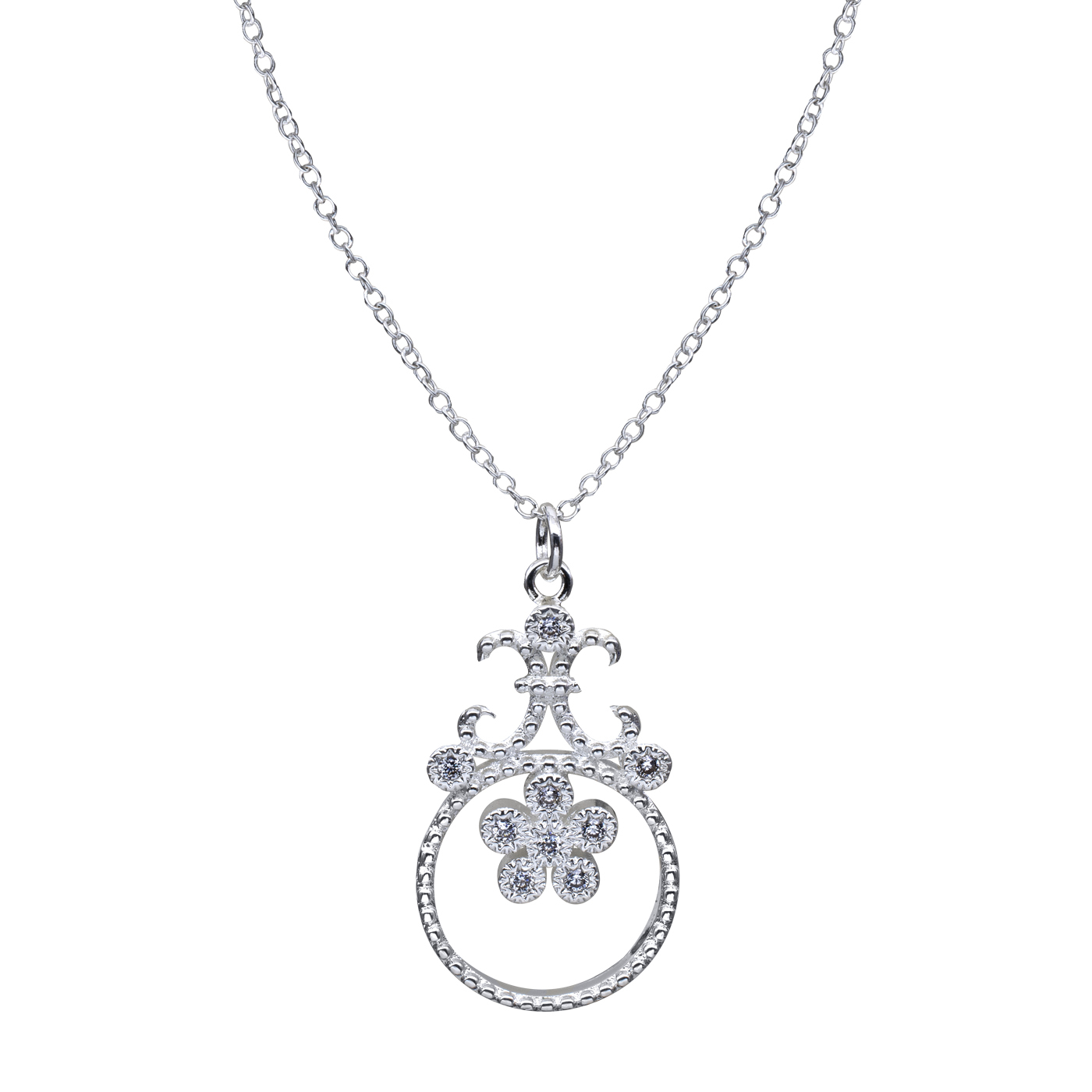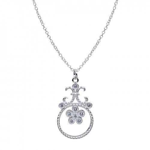 Dije de plata 925 con diseño de circulo y flores con incrustaciones de cristales en color blanco. Fabricado en una estructura de aleación de platino con rodio sin níquel.