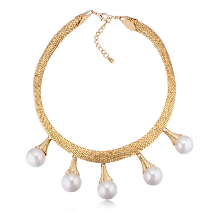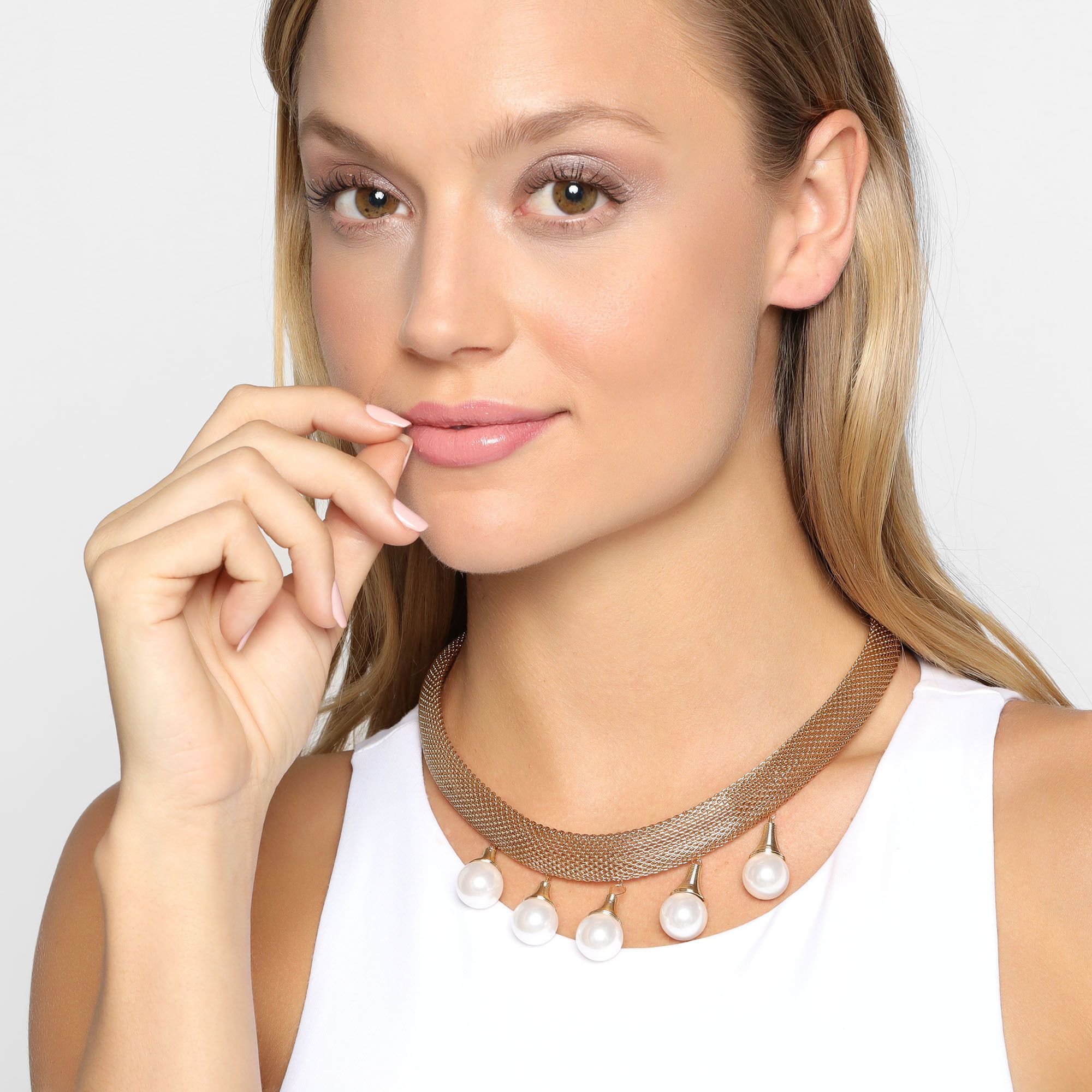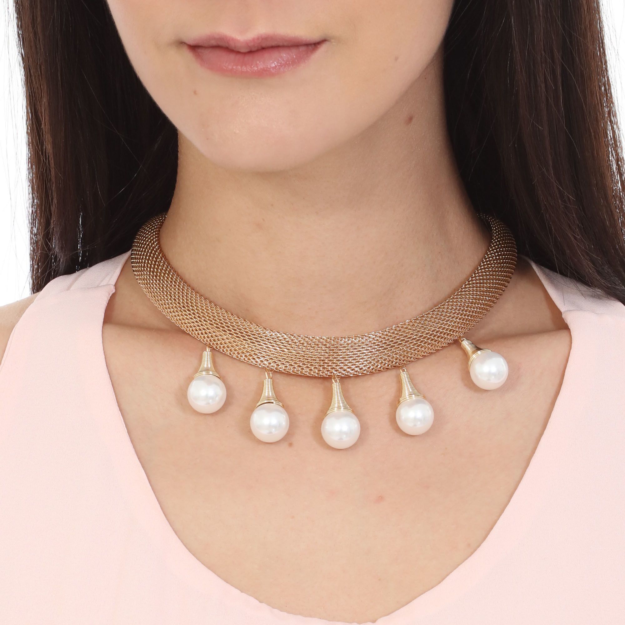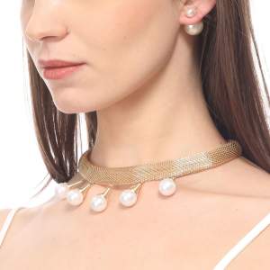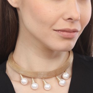 Hermoso collar en baño de oro amarillo de 18 quilates, fino diseño de malla con detalles de perlas en color blanco. Fabricado en una estructura de aleación de platino con rodio sin níquel.