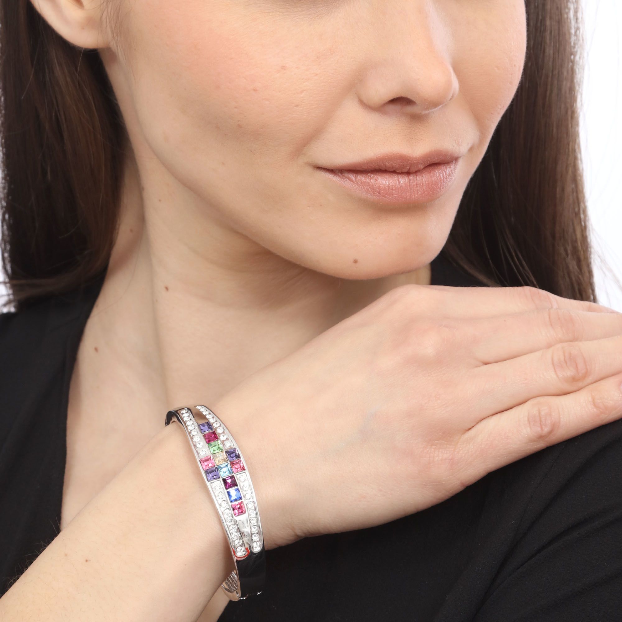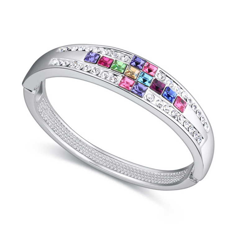 Hermoso brazalete en baño de oro blanco de 18 quilates , con incrustaciones de cristales corte baguette en diferentes colores. Fabricado en una estructura de aleación de platino con rodio sin níquel.