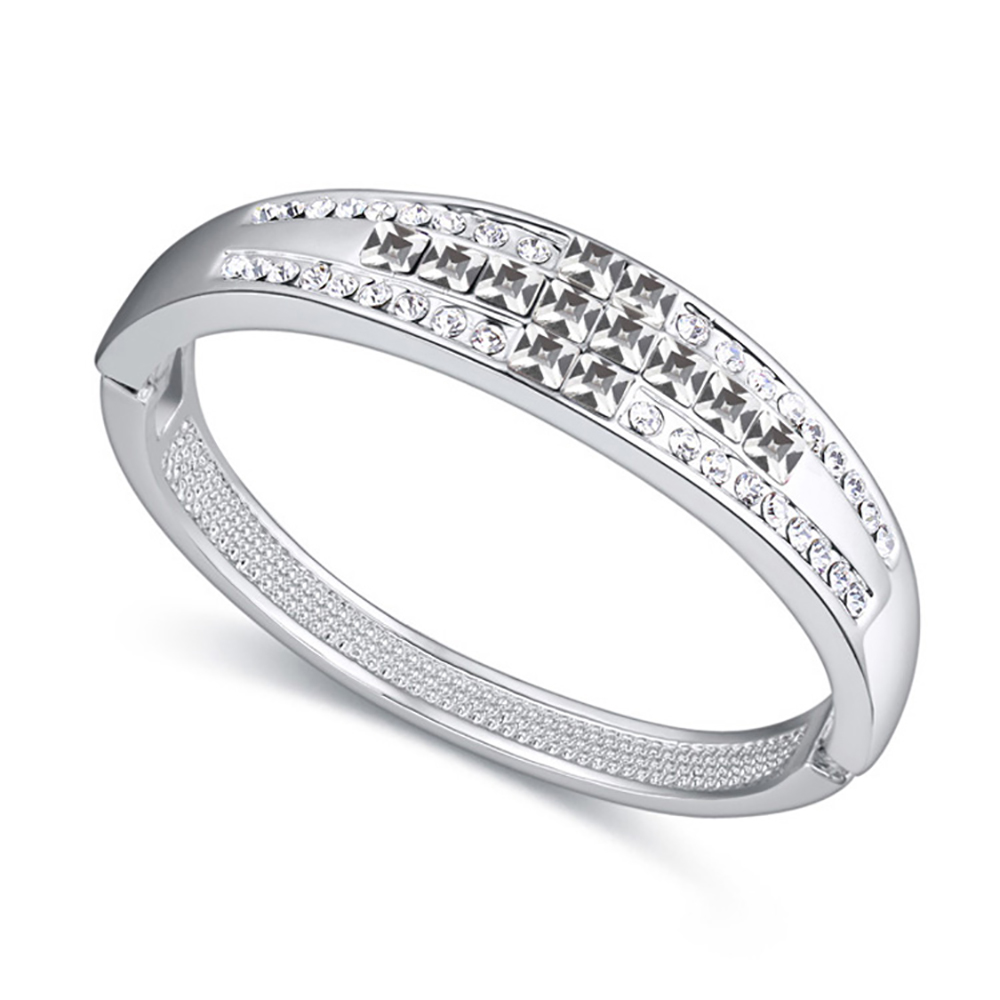Hermoso brazalete en baño de oro blanco de 18 quilates , con incrustaciones de cristales corte baguette en color blanco. Fabricado en una estructura de aleación de platino con rodio sin níquel.