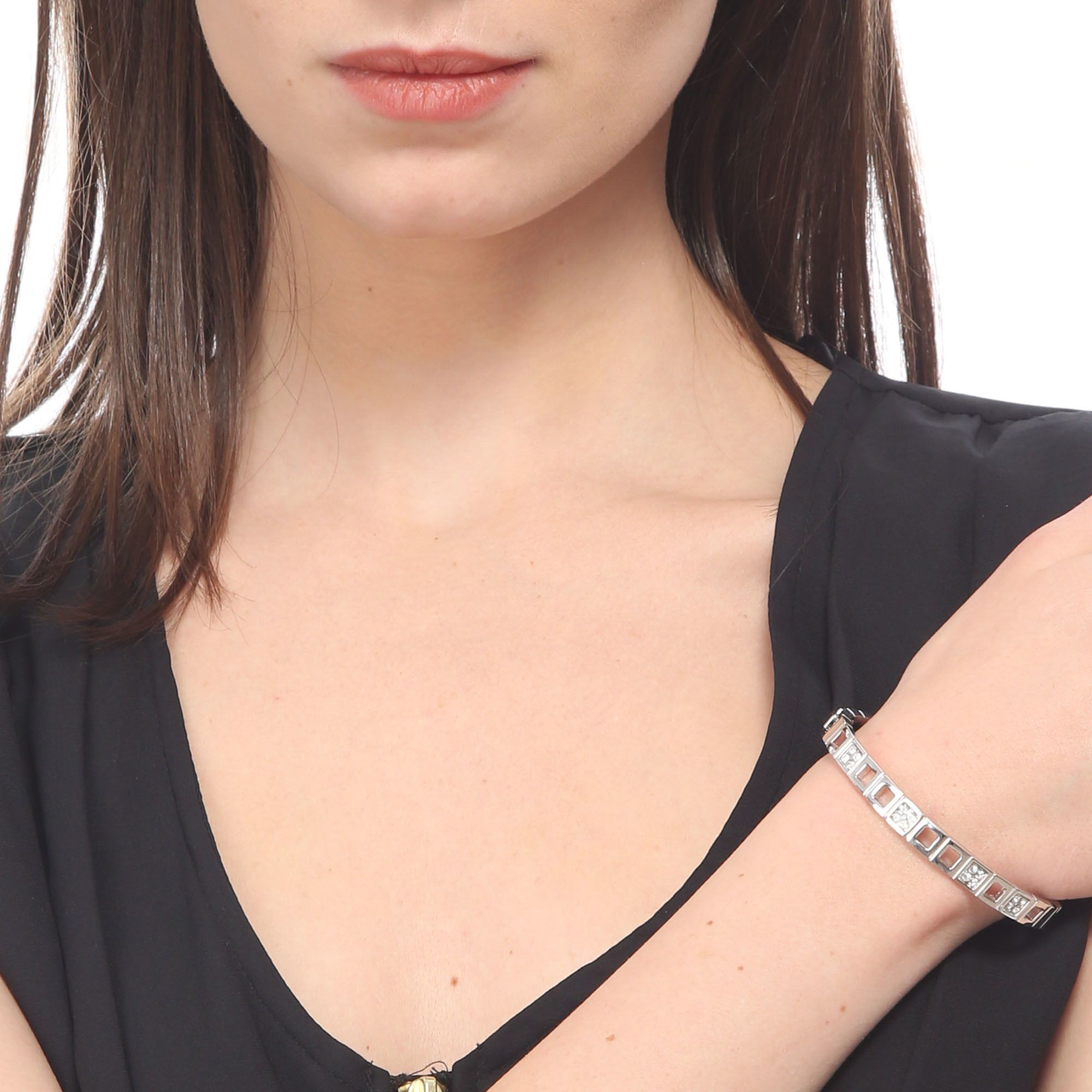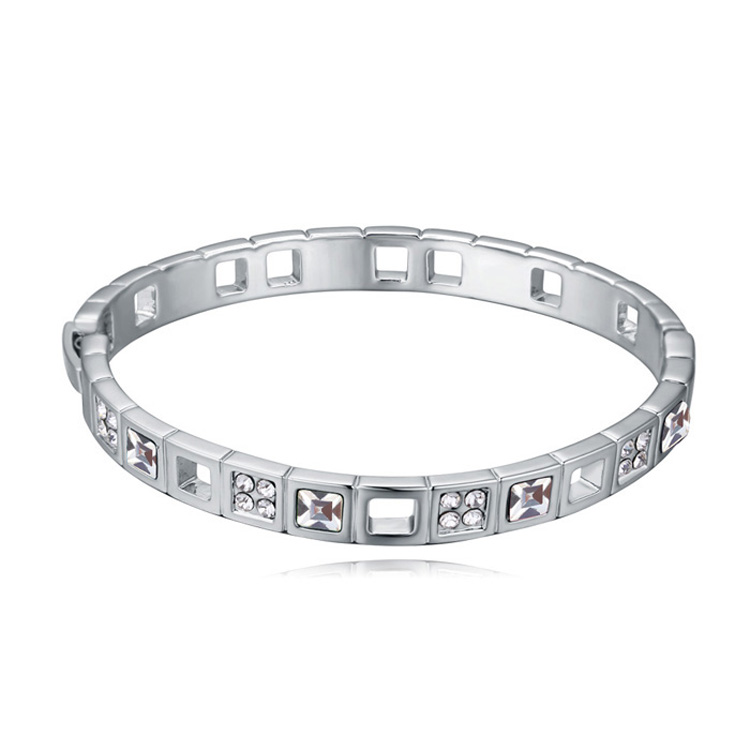Lindo brazalete en baño de oro blanco de 18 quilates, diseño calado con incrustaciones de cristales color blanco. Fabricado en una estructura de aleación de platino con rodio sin níquel.
