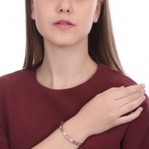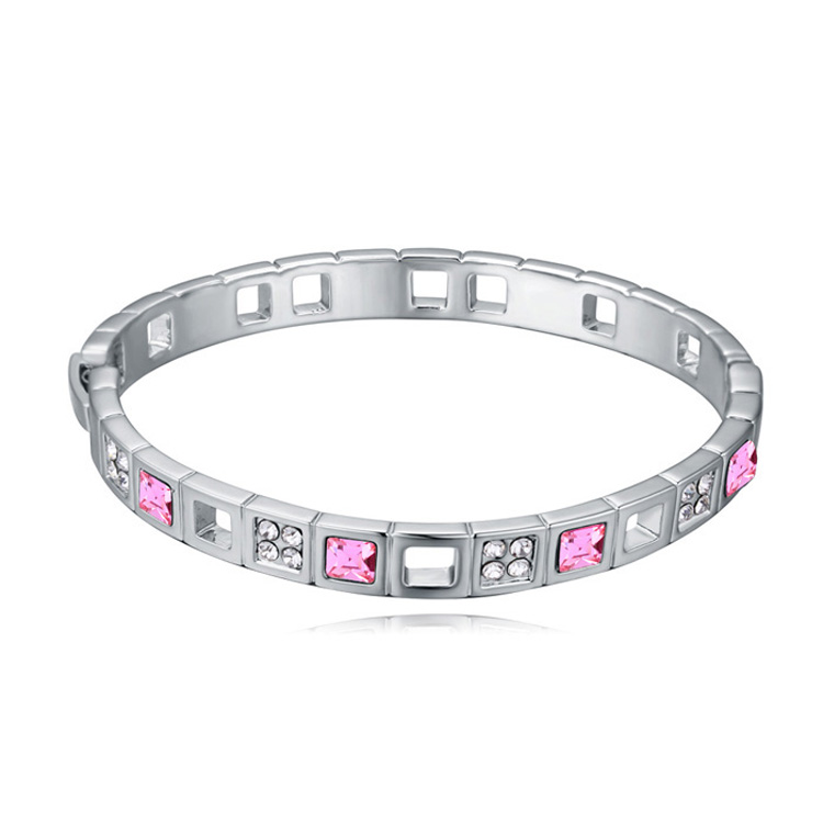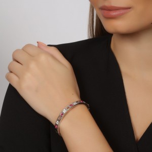 Lindo brazalete en baño de oro blanco de 18 quilates, diseño calado con incrustaciones de cristales en color rosa y blanco. Fabricado en una estructura de aleación de platino con rodio sin níquel.