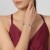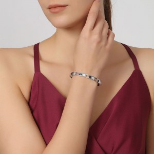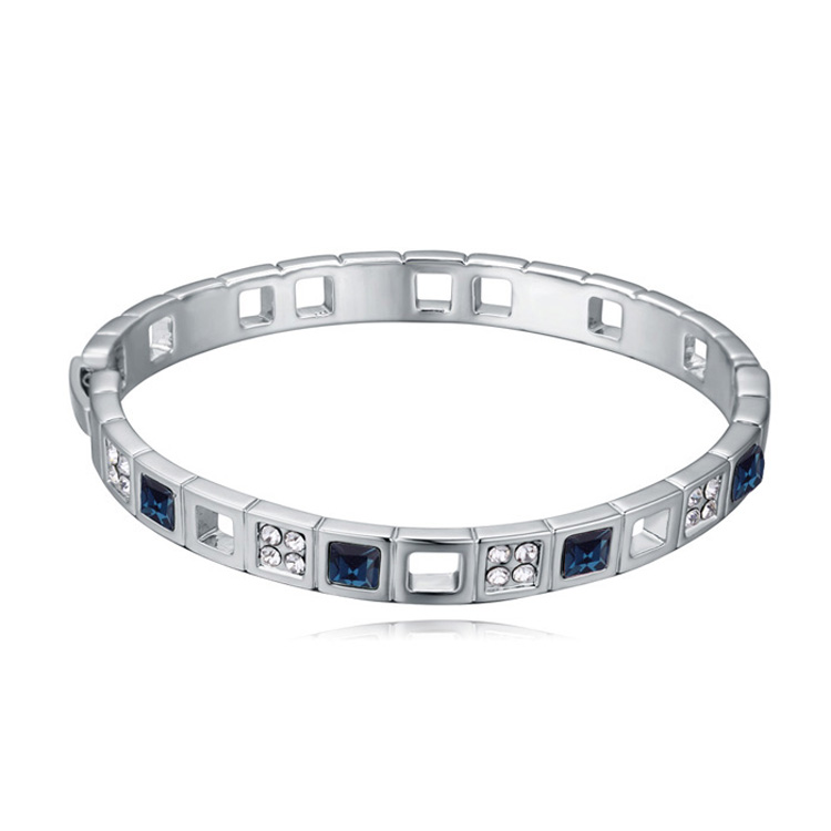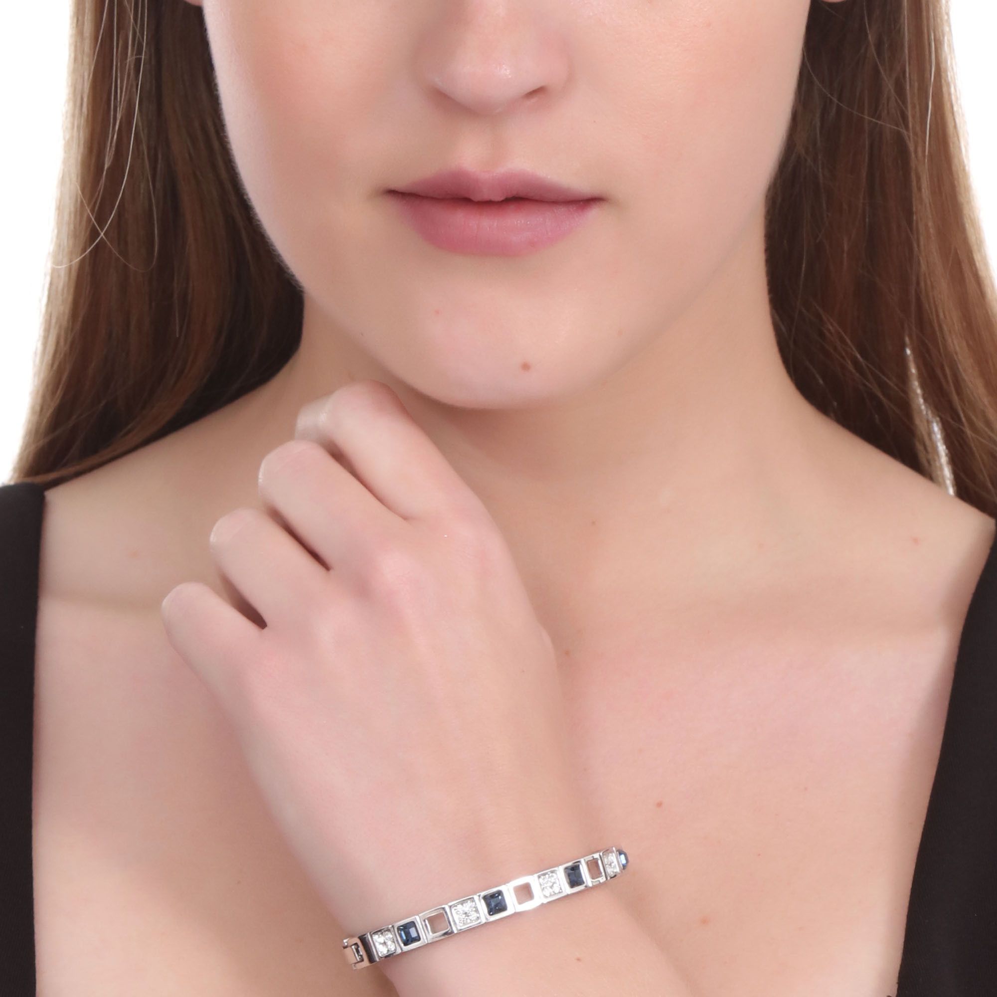 Lindo brazalete en baño de oro blanco de 18 quilates, diseño calado e incrustaciones de cristales en color azul y blanco. Fabricado en una estructura de aleación de platino con rodio sin níquel.