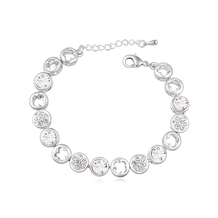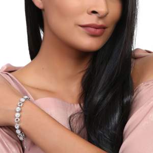 Lindo brazalete en baño de oro blanco de 18 quilates con incrustaciones de cristales corte brillante color blanco. Fabricado en una estructura de aleación de platino con rodio sin níquel.