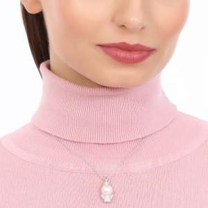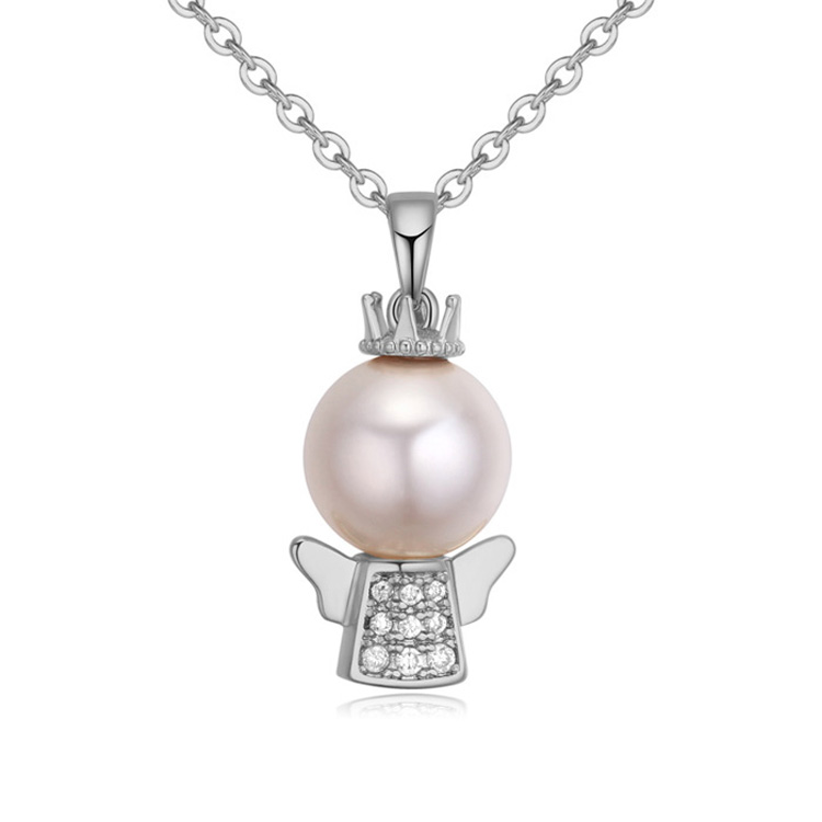 Hermoso dije en baño de oro blanco de 18 quilates, diseño de angel con perla e incrustaciones de cristales en color blanco. Fabricado en una estructura de aleación de platino con rodio sin níquel.