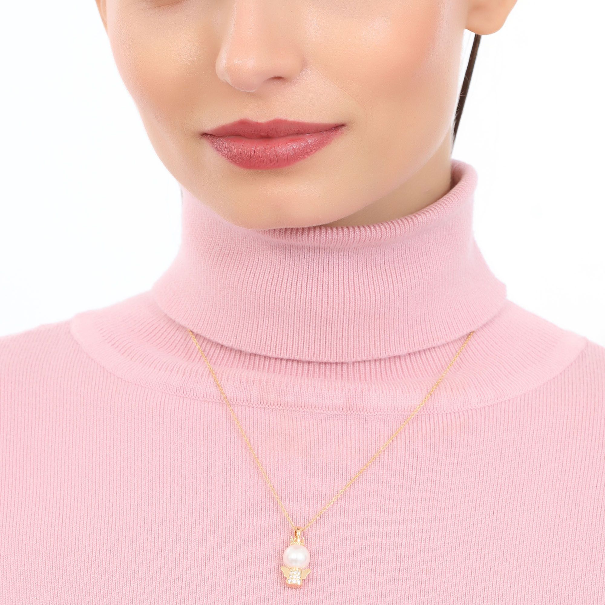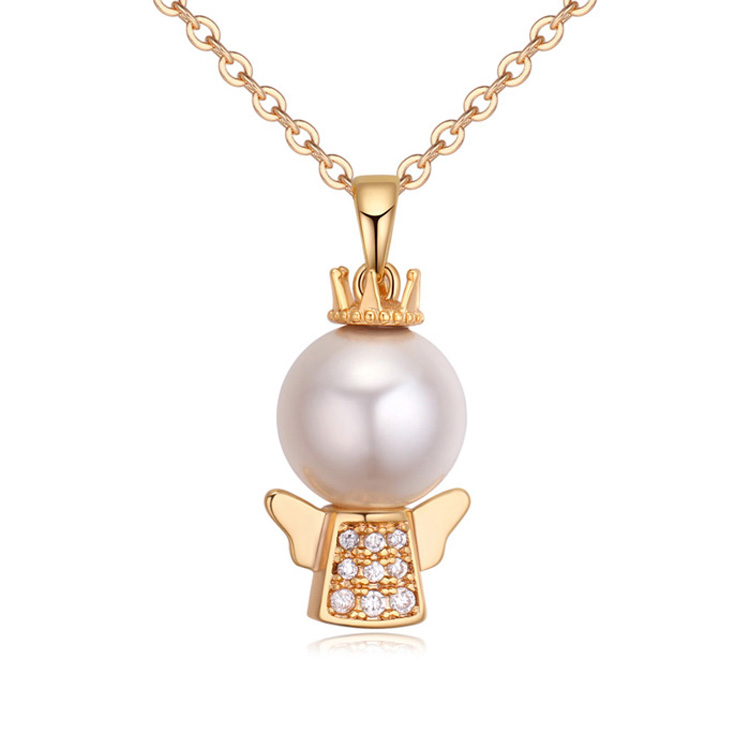 Hermoso dije en baño de oro amarillo de 18 quilates, diseño de ángel con perla e incrustaciones de cristales en color blanco. Fabricado en una estructura de aleación de platino con rodio sin níquel.