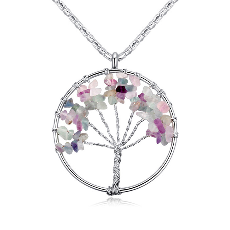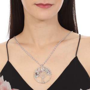 Dije con cadena en baño de oro blanco de 18 quilates, diseño de árbol con cuarzos en colores pastel. Fabricado en una estructura de aleación de platino con rodio sin níquel.