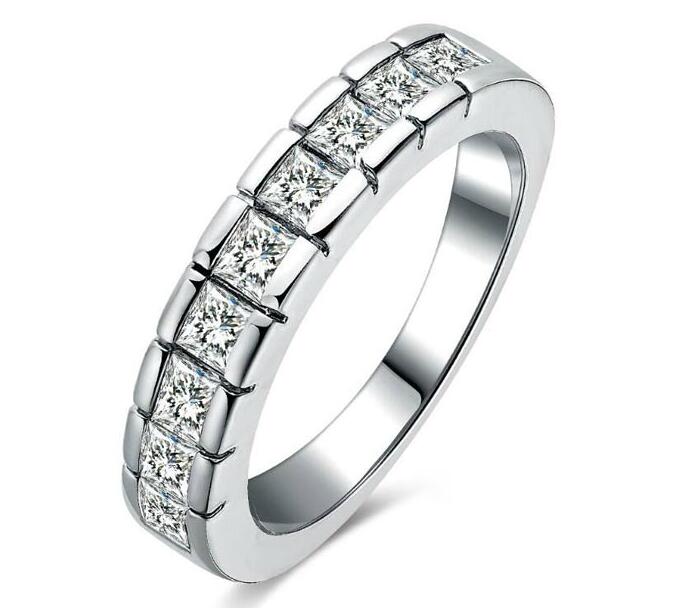 Anillo en baño de oro blanco de 18 quilates, fino diseño con detalles biselados e incrustaciones de cristales en color blanco. Fabricado en una estructura de aleación de platino con rodio sin níquel.
