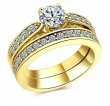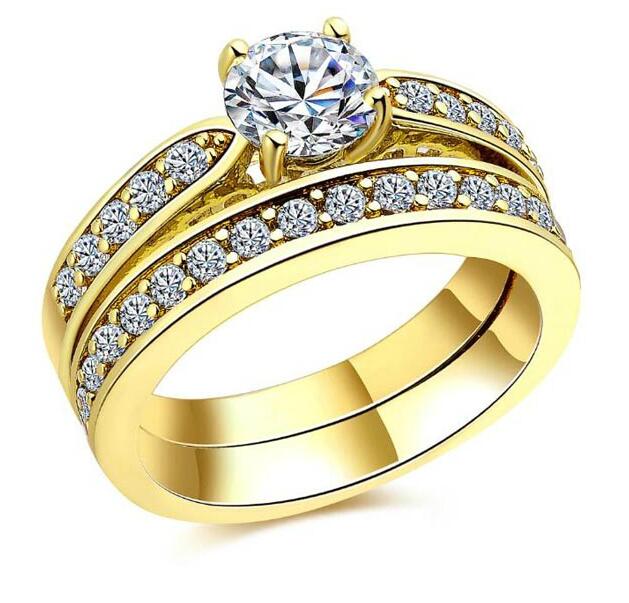 Anillo doble en baño de oro amarillo de 18 quilates, fino diseño, con puntas estilo almedra, cristal blanco corte brillante e incrustaciones de cristales en color blanco. Fabricado en una estructura de aleación de platino con rodio sin níquel.