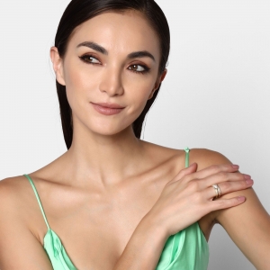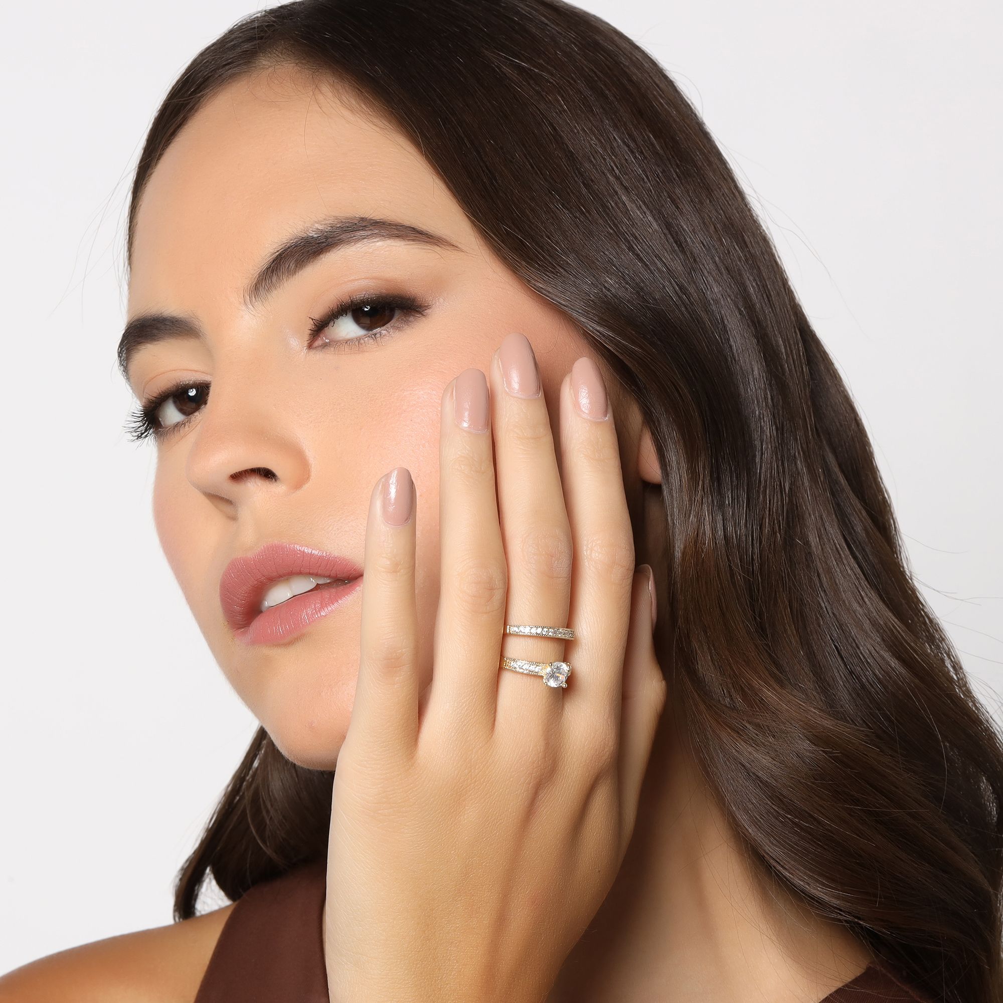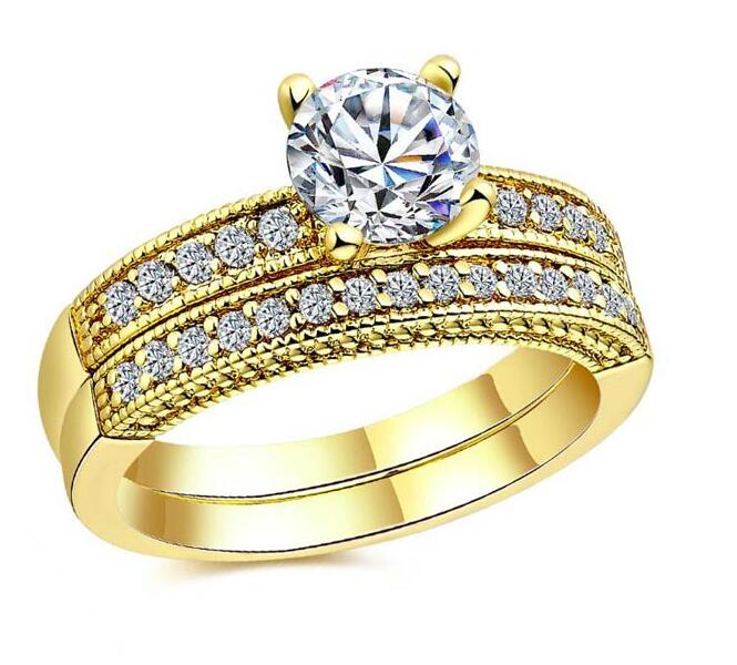 Anillo en baño de oro amarillo de 18 quilates, fino diseño de anillo doble con cristal blanco corte brillante e incrustaciones de cristales en color blanco. Fabricado en una estructura de aleación de platino con rodio sin níquel.