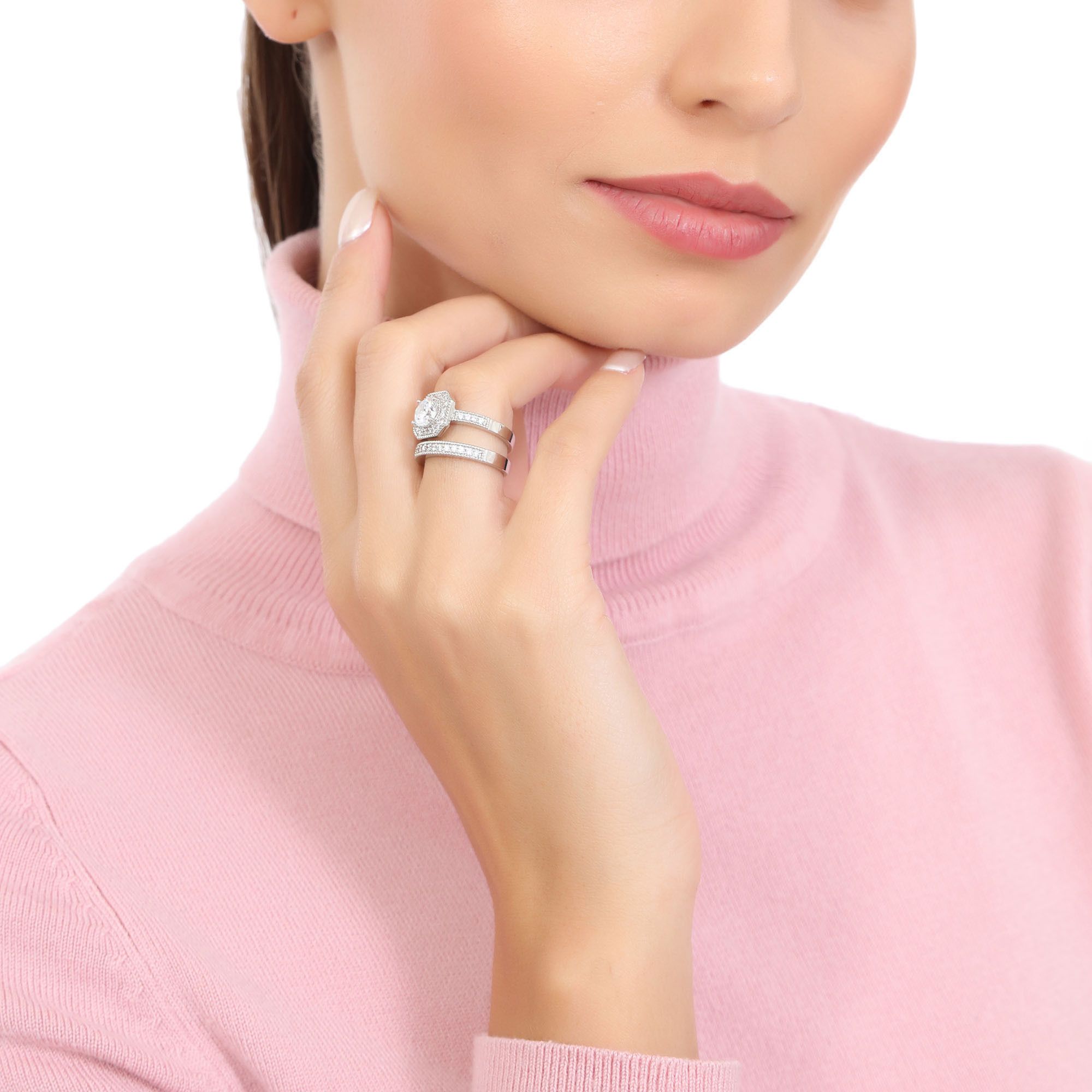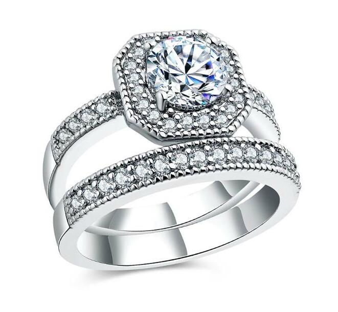 Anillo en baño de oro blanco de 18 quilates, fino diseño de octágono con cristal blanco corte brillante e incrustaciones de cristales en color blanco. Fabricado en una estructura de aleación de platino con rodio sin níquel.