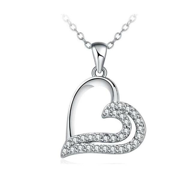 Dije con cadena en baño de oro blanco de 18 quilates, fino diseño de corazón con incrustaciones de cristales en color blanco. Fabricado en una estructura de aleación de platino con rodio sin níquel.