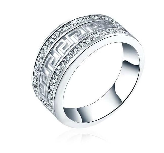 Anillo en baño de oro blanco de 18 quilates, fino diseño, con grecas caladas e incrustaciones de cristales en color blanco. Fabricado en una estructura de aleación de platino con rodio sin níquel.