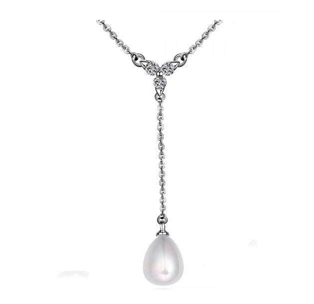 Dije con cadena en baño de oro blanco de 18 quilates, fino diseño, con gota de perla e incrustaciones de cristales en color blanco. Fabricado en una estructura de aleación de platino con rodio sin níquel.
