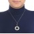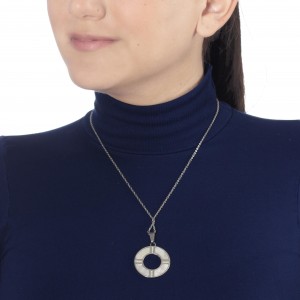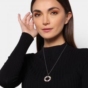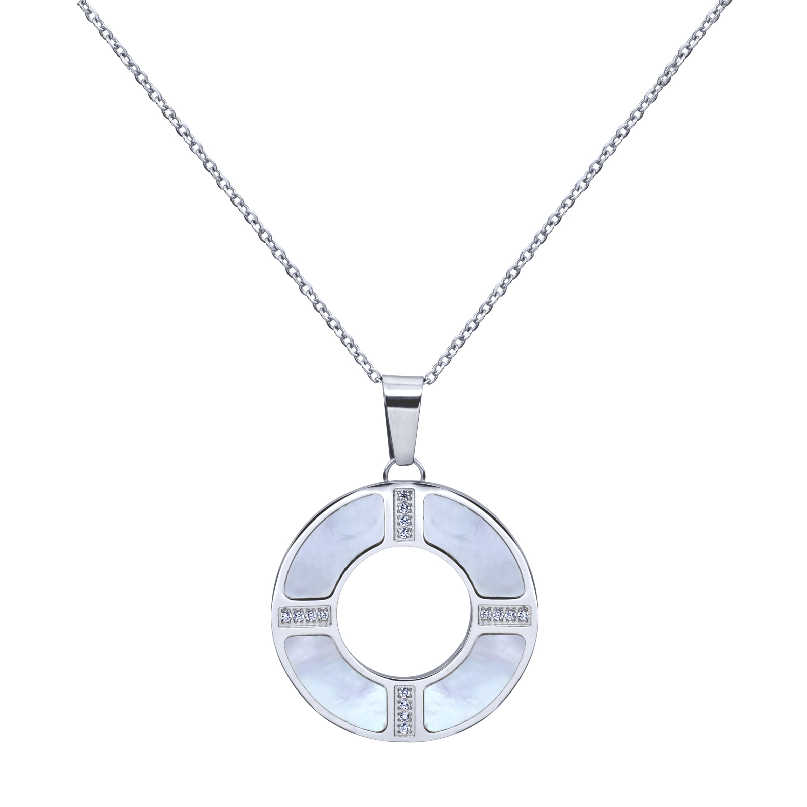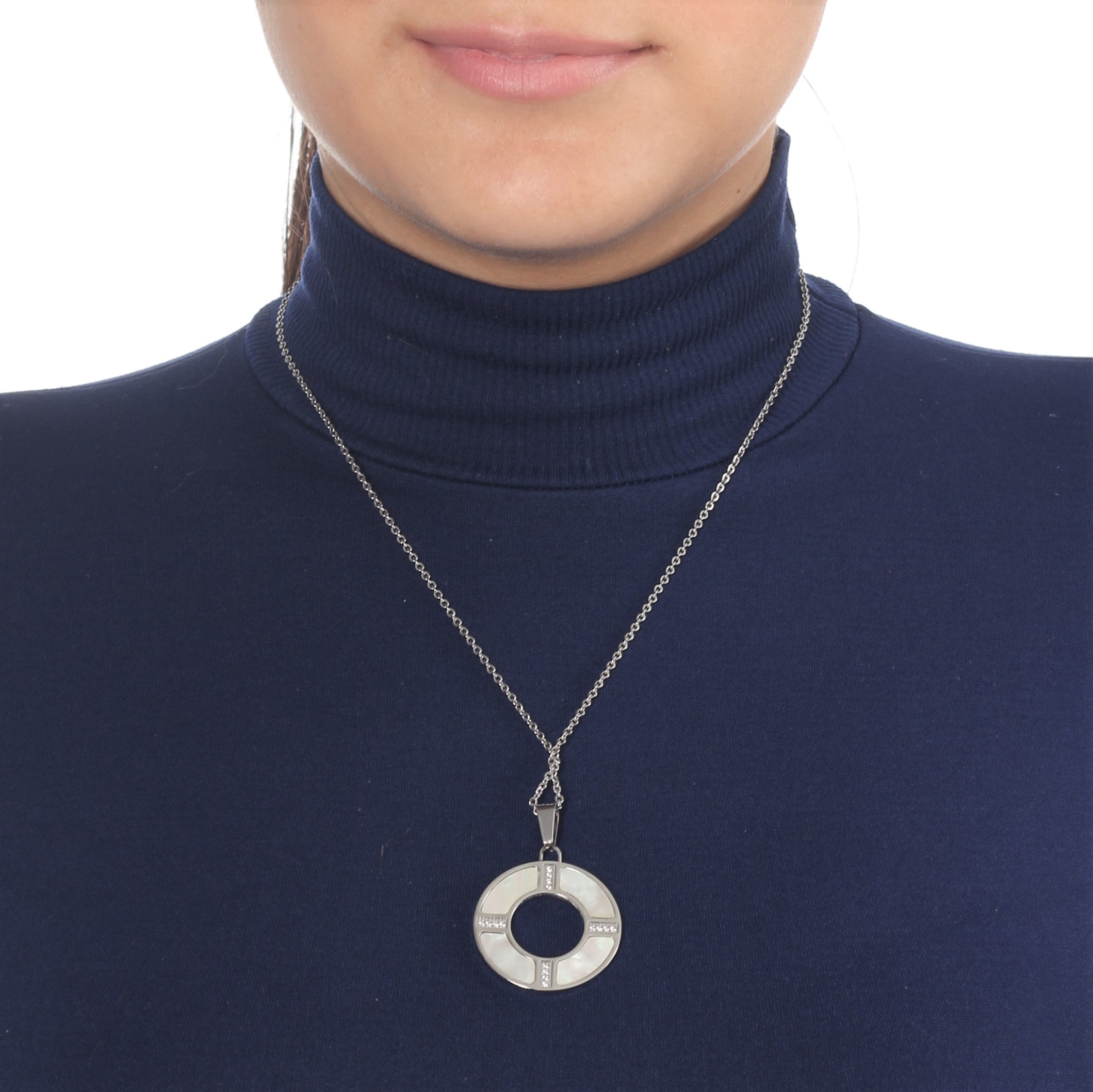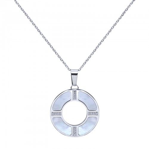 Dije con cadena en baño de oro blanco de 18 quilates, diseño de circulo con detalle de madre perla e incurstaciones de cristales en color blanco. Fabricado en una estructura de aleación de platino con rodio sin níquel.
