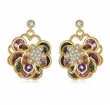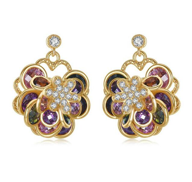 Aretes en baño de oro amarillo de 18 quilates, diseño de flor con incrustaciones de cristales blancos y cristales de colores corte brillante. Fabricado en una estructura de aleación de platino con rodio sin níquel. 1. Joyería Hipo alergénica. 2. Incluye cajita de Joyería. 4. Garantía de 30 días por defectos de fabrica