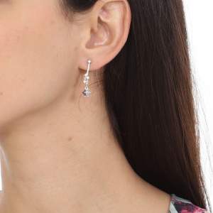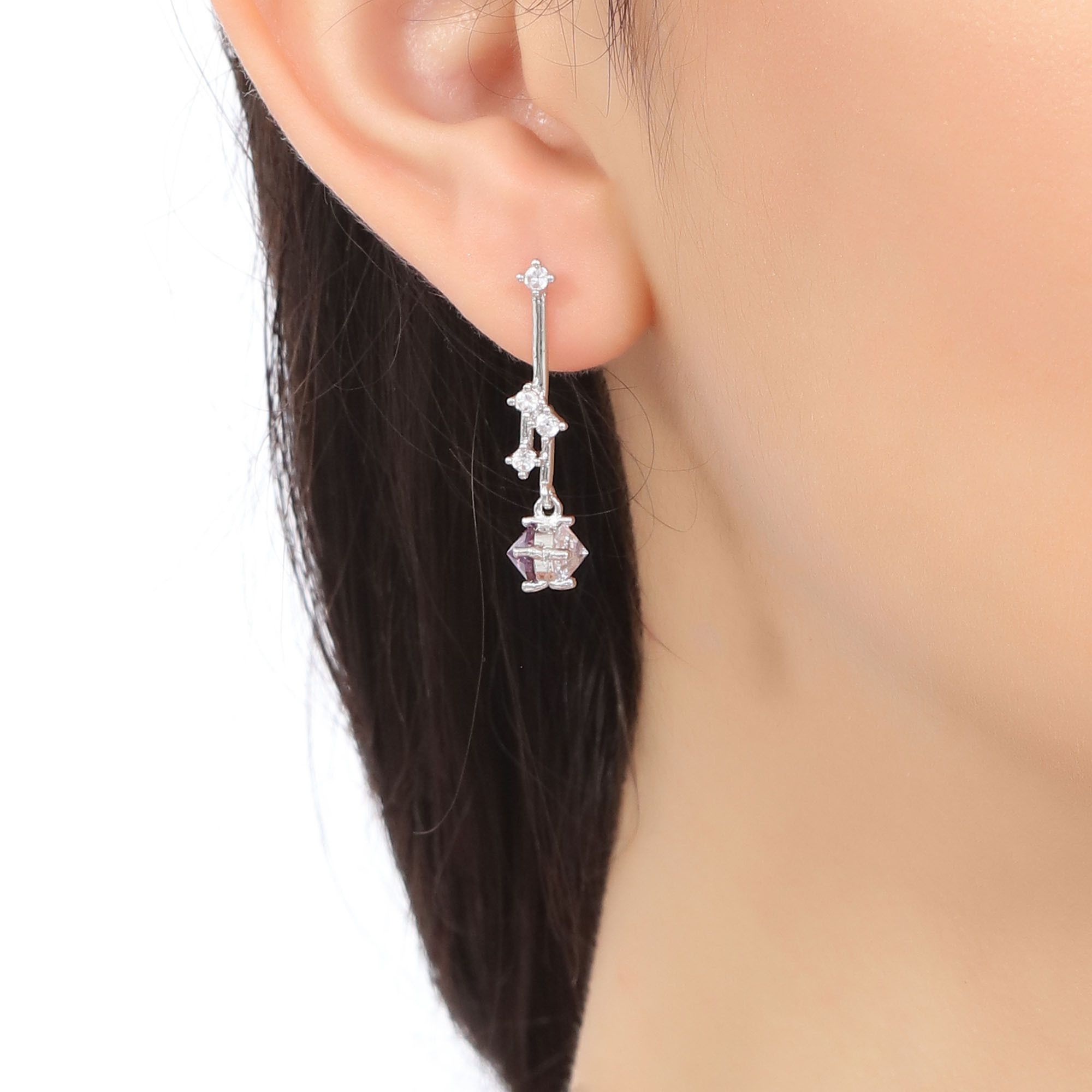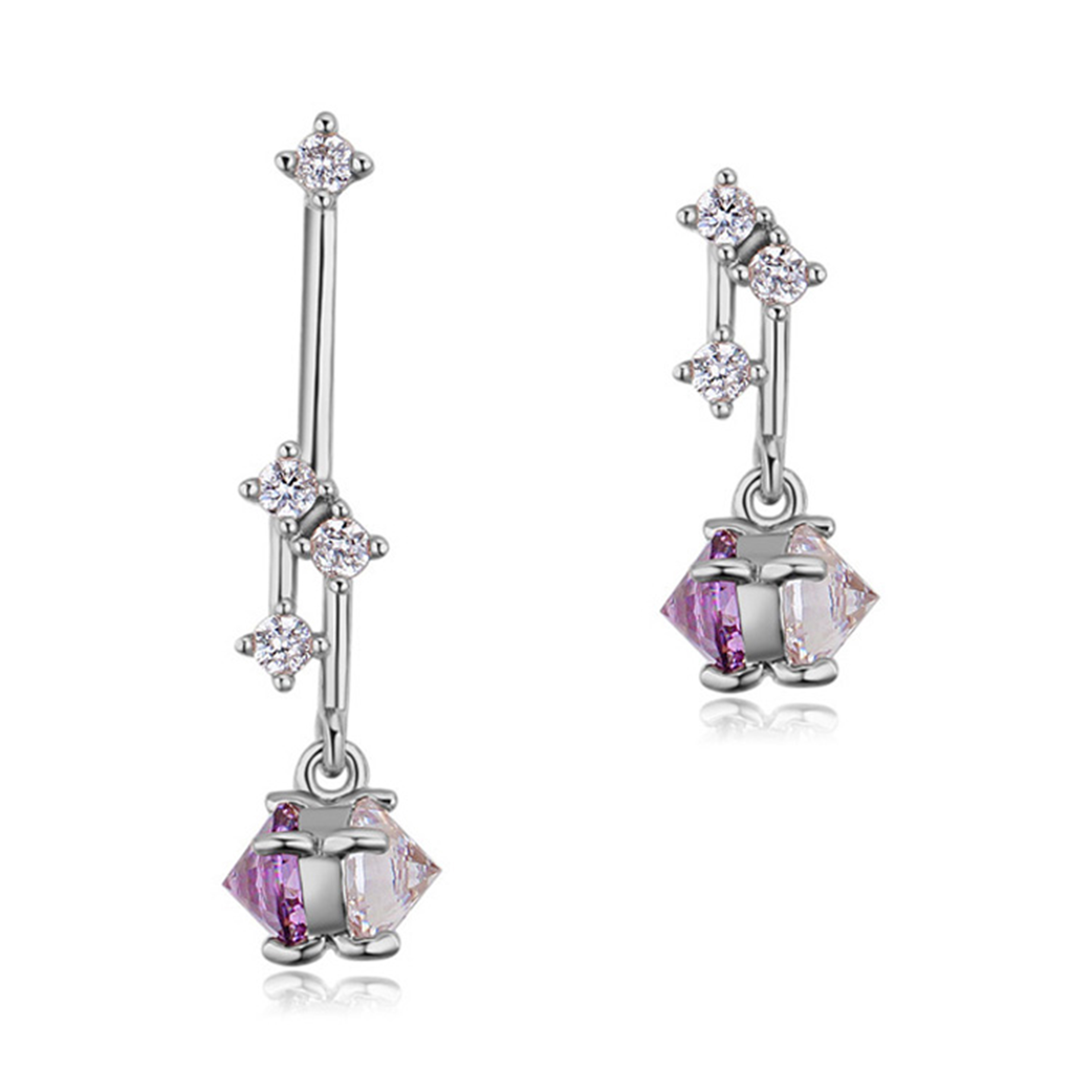 Lindos aretes en baño de oro blanco de 18 quilates, original diseño con incrustaciones de cristal en color blanco y lila. Fabricado en una estructura de aleación de platino con rodio sin níquel.