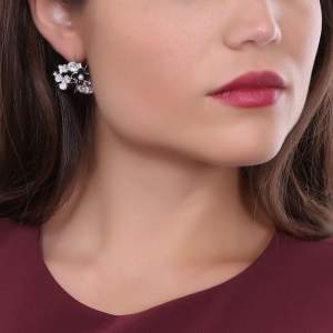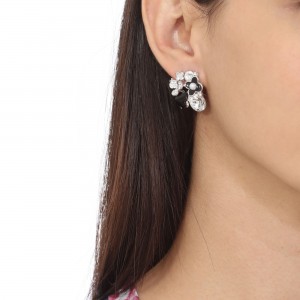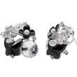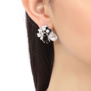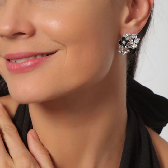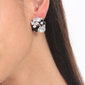 Hermosos aretes en baño de oro blanco de 18 quilates, con mariposa de crisital color negro, cristal blanco corte brillante, flor esmaltada en color negro e incrustaciones de cristales blancos. Fabricado en una estructura de aleación de platino con rodio sin níquel.
