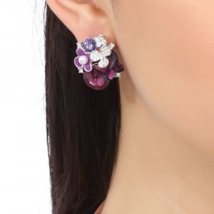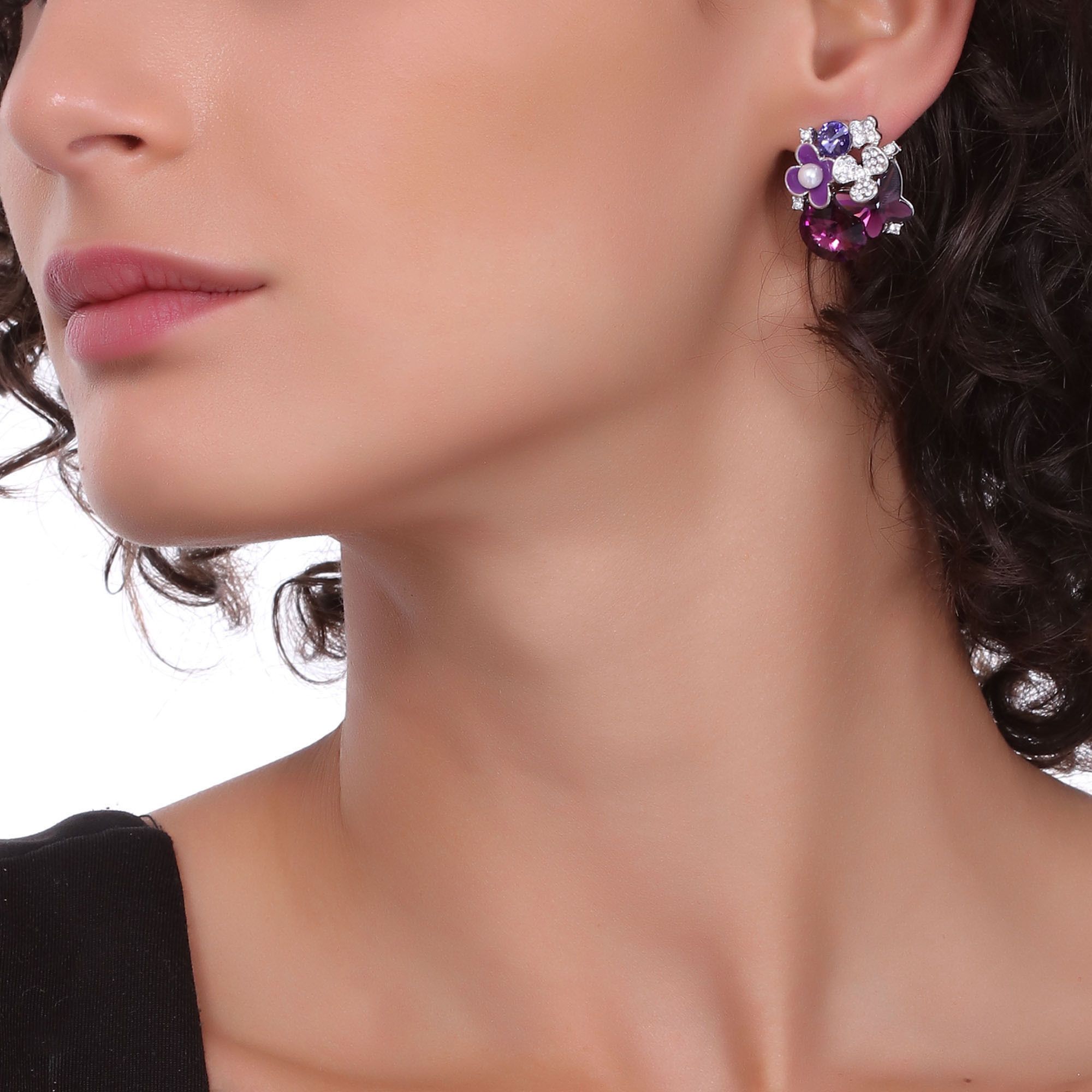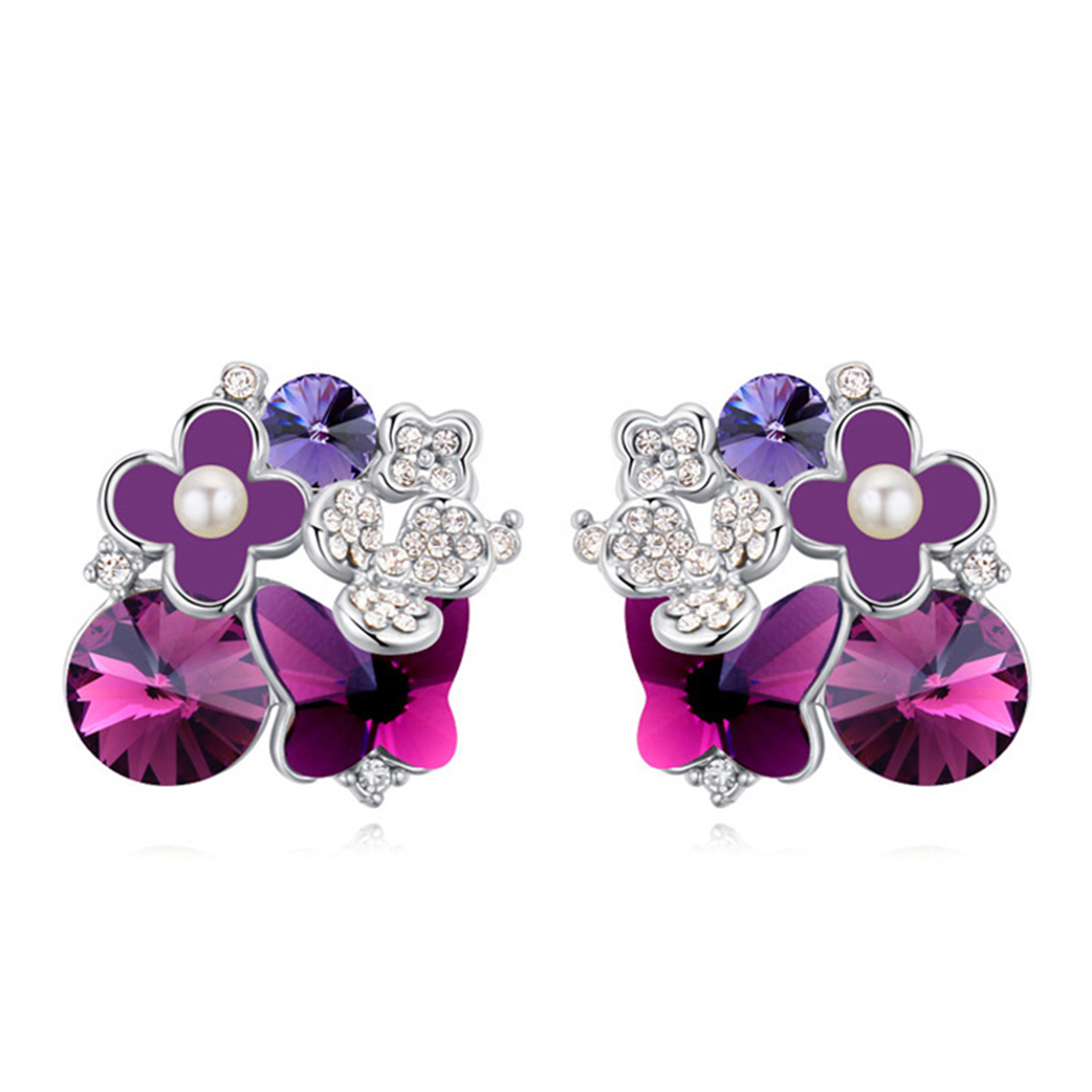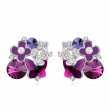 Hermosos aretes en baño de oro blanco de 18 quilates, con mariposa de crisital color morado, cristal violeta corte brillante, flor esmaltada en color púrpura e incrustaciones de cristales blancos. Fabricado en una estructura de aleación de platino con rodio sin níquel.