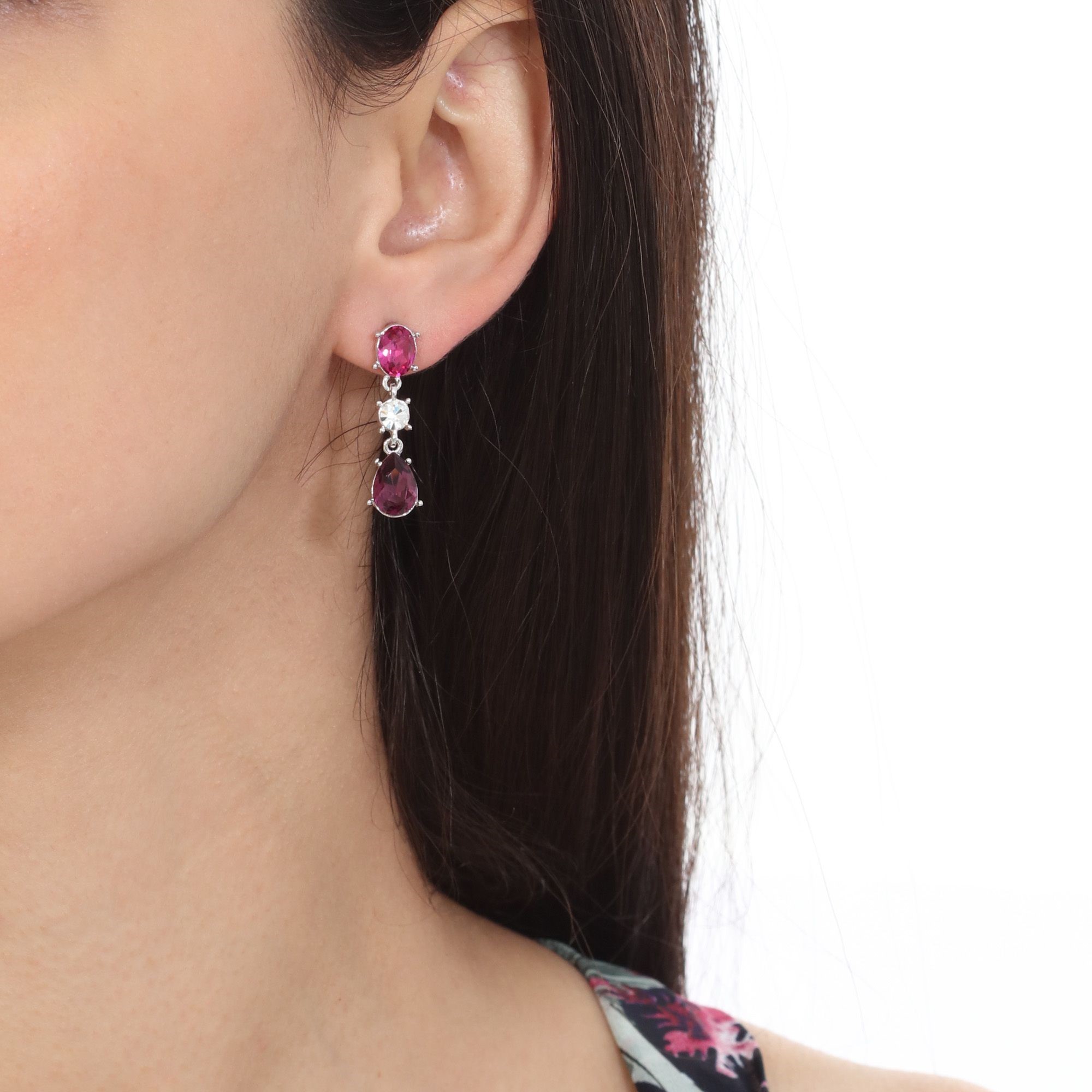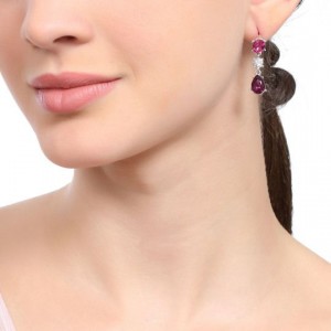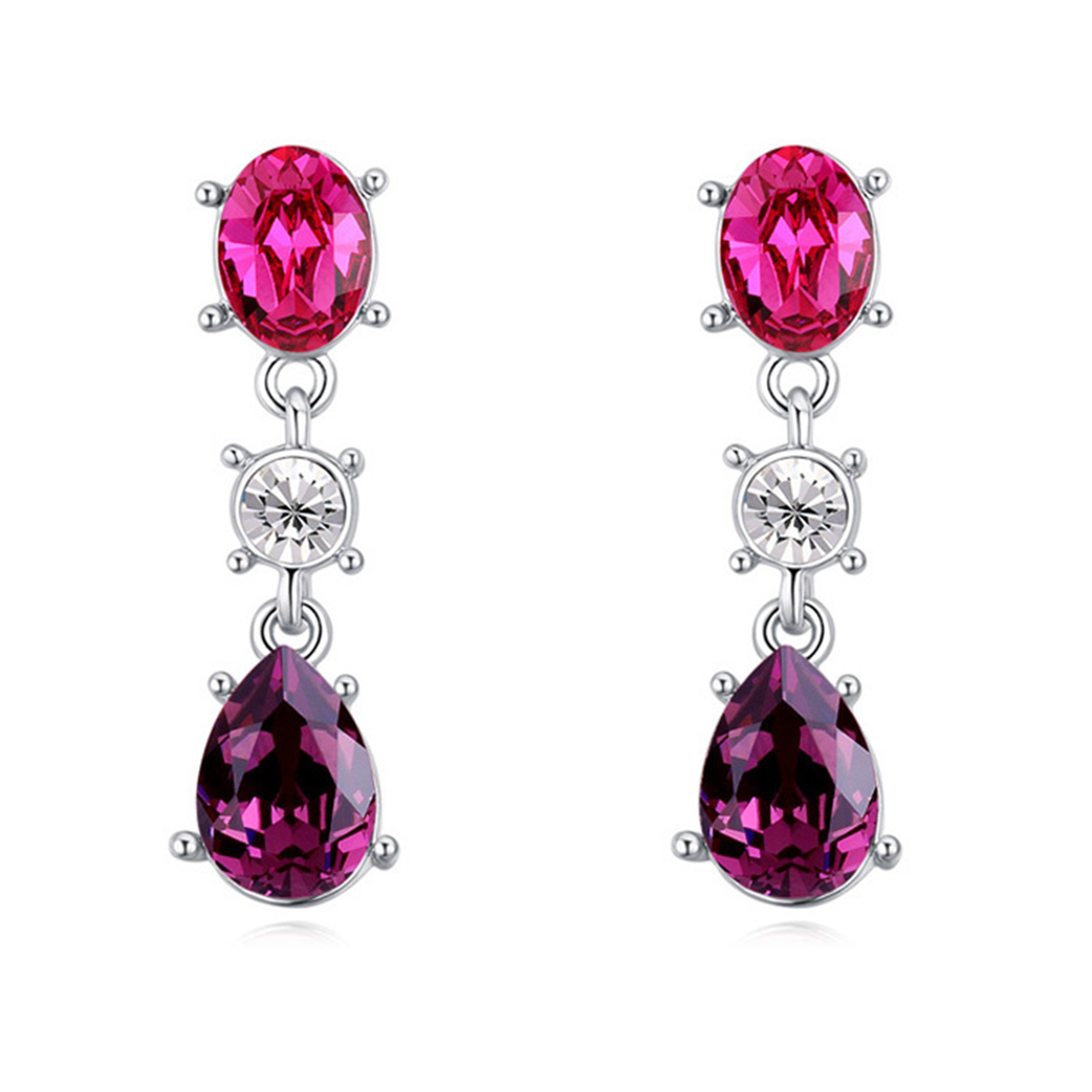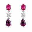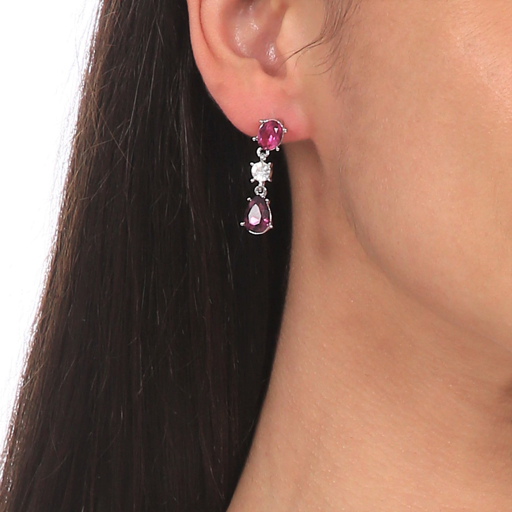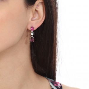 Hermosos aretes en baño de oro blanco de 18 quilates, diseño con incrustación de cristal morado corte pera, cristal fucsia corte oval y cristal blanco corte brillante. Fabricado en una estructura de aleación de platino con rodio sin níquel.