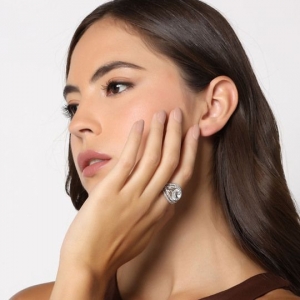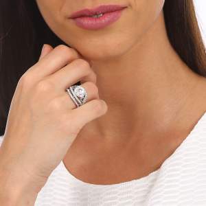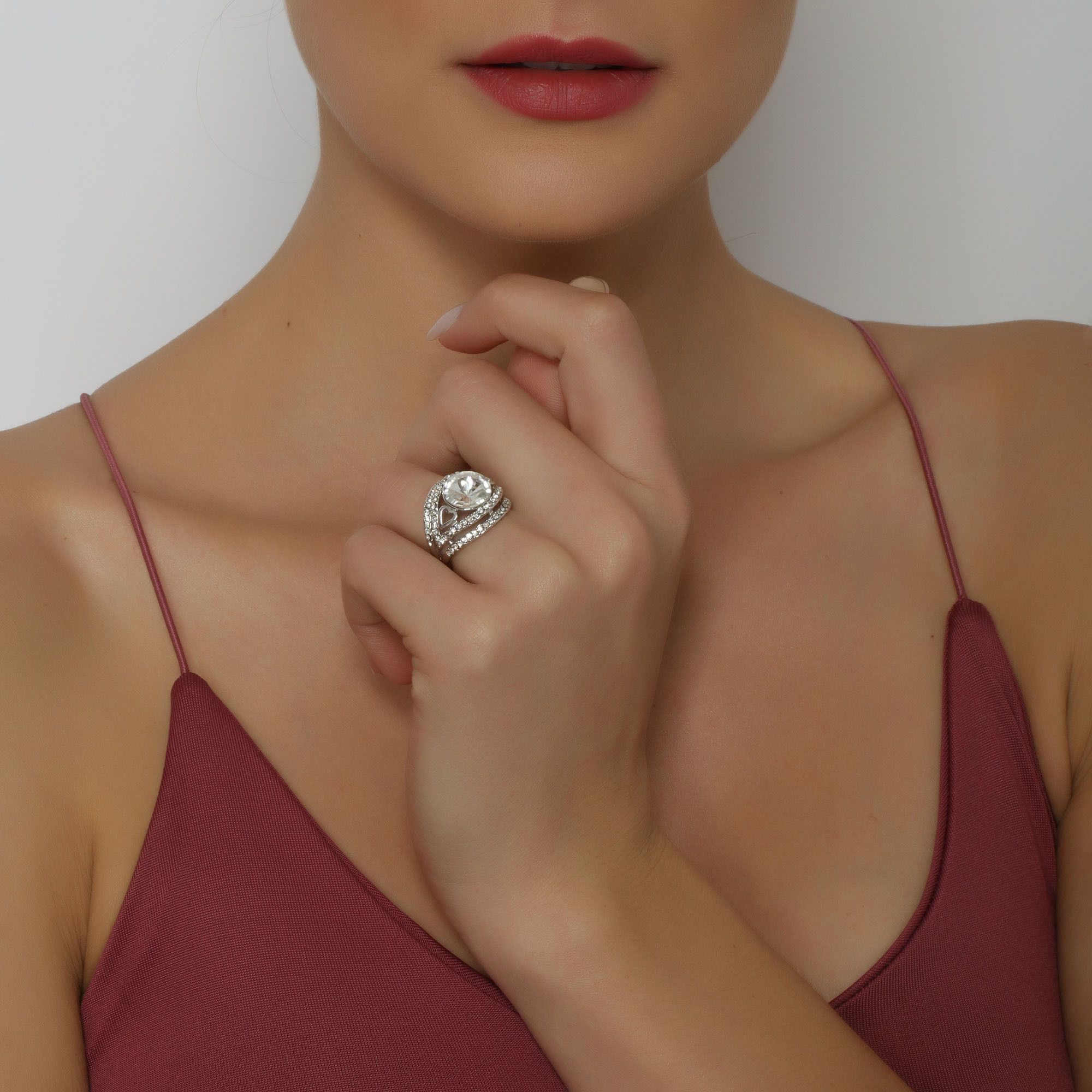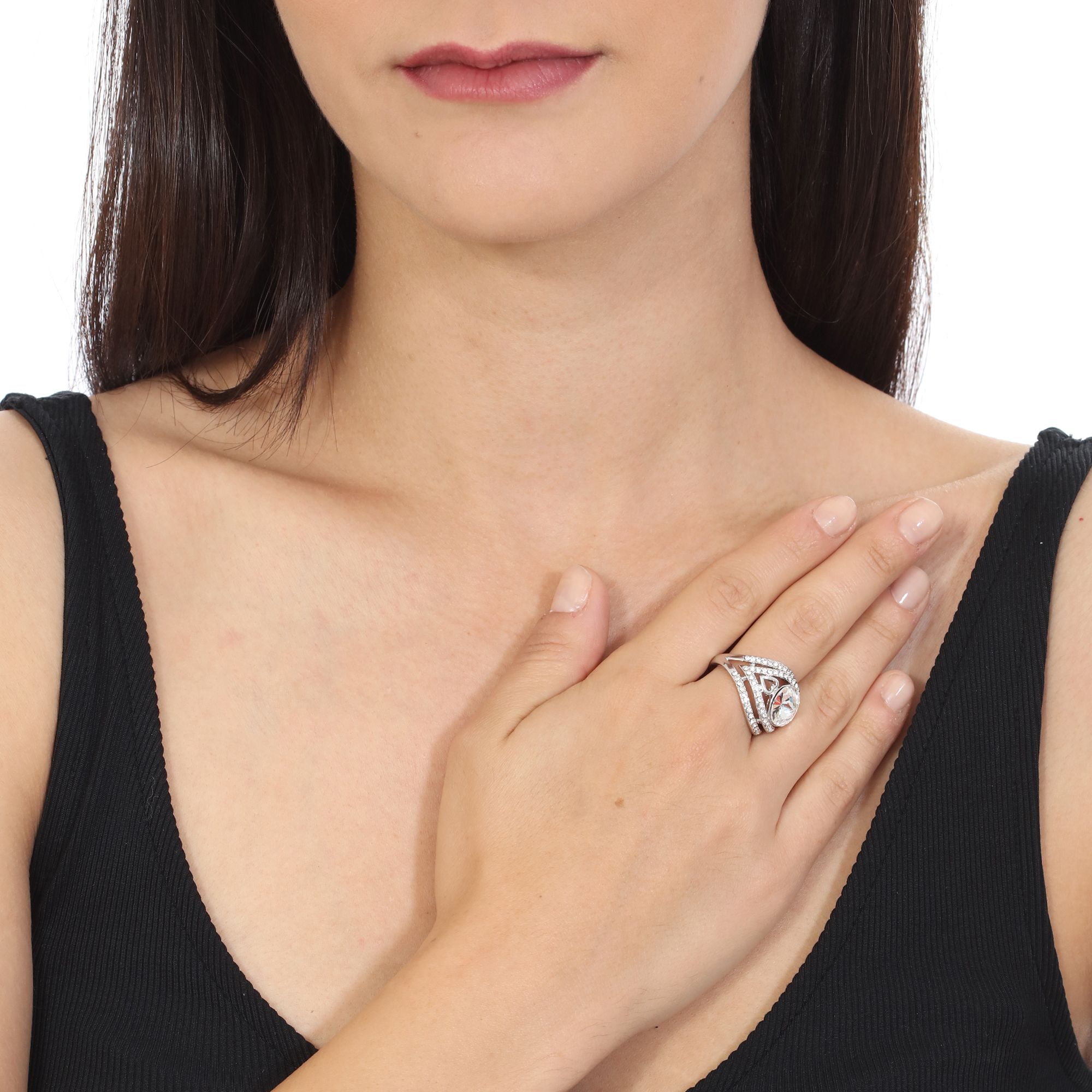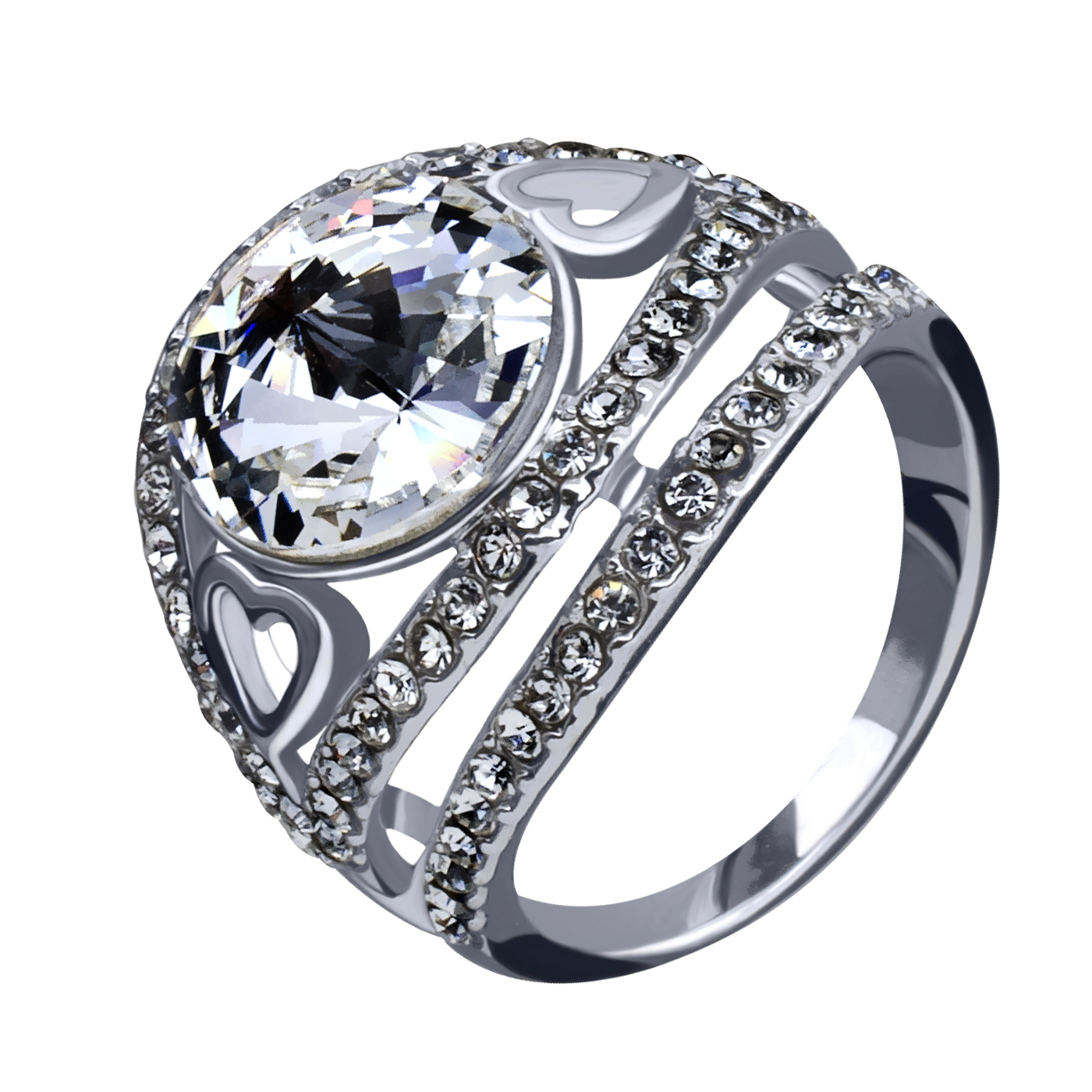 Lindo anillo en baño de oro blanco de 18 quilates, diseño de corazones, con cristal aurora boreal corte brillante e incrustaciones de cristales en color blanco. Fabricado en una estructura de aleación de platino con rodio sin níquel.