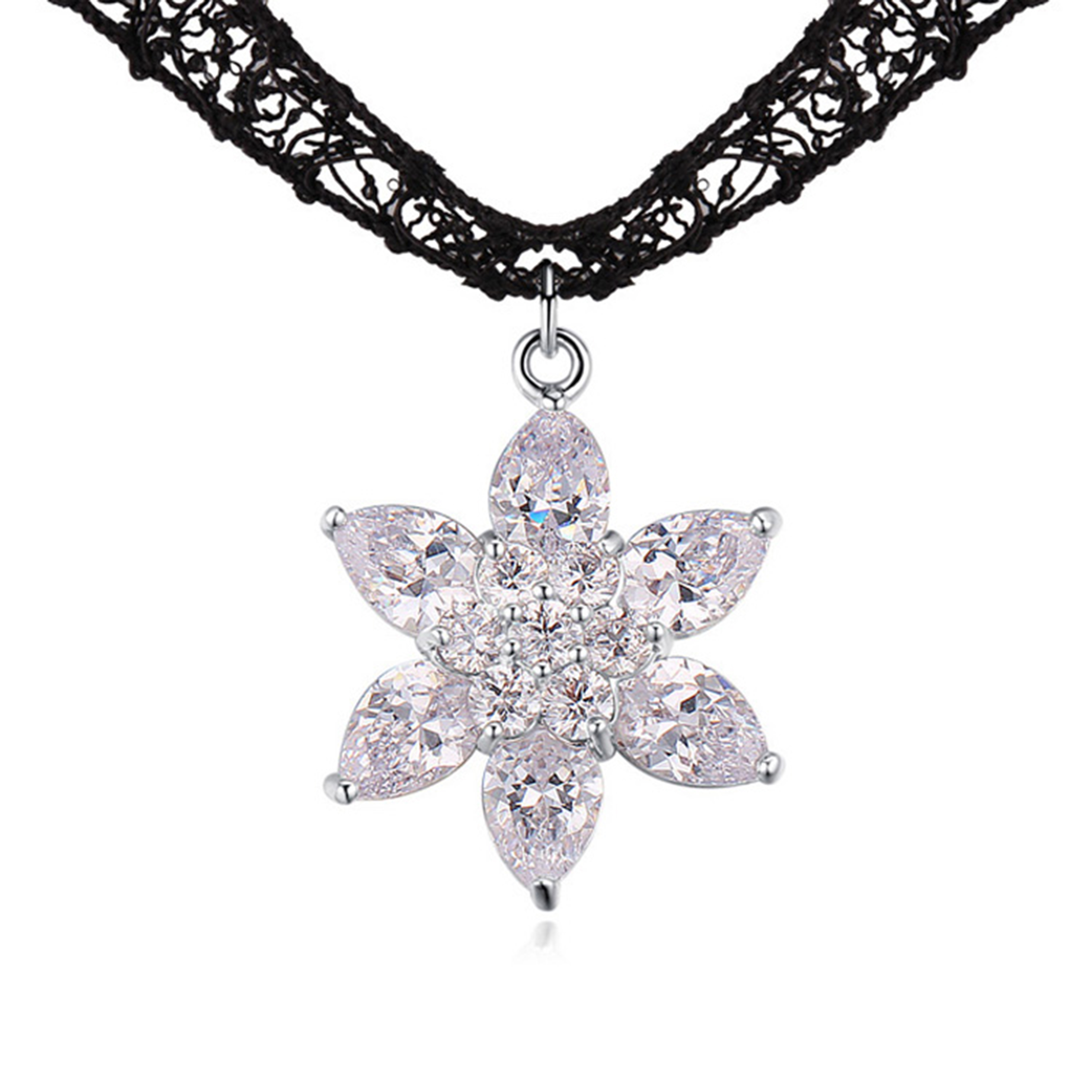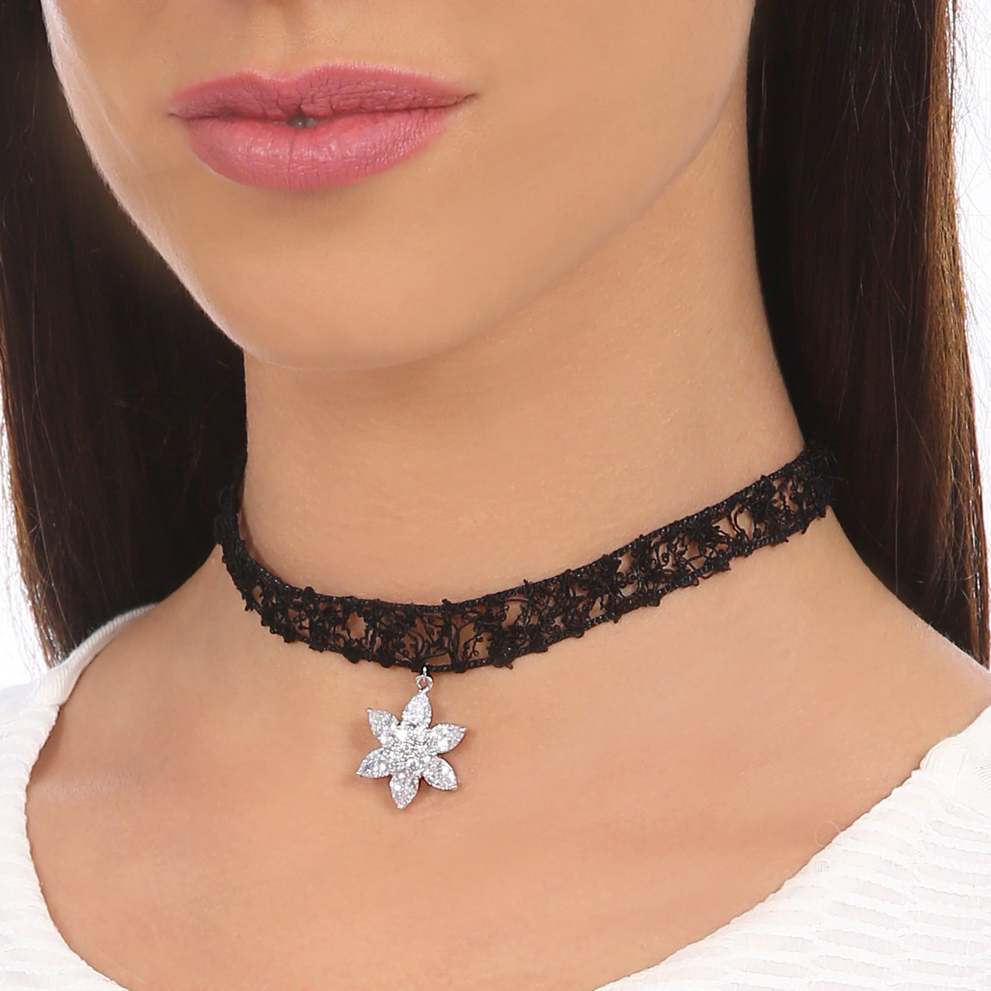 Collar en encaje color negro, elegante diseño con dije en forma de estrella e incrustaciones de cristales en color blanco. Fabricado en una estructura de aleación de platino con rodio sin níquel.