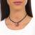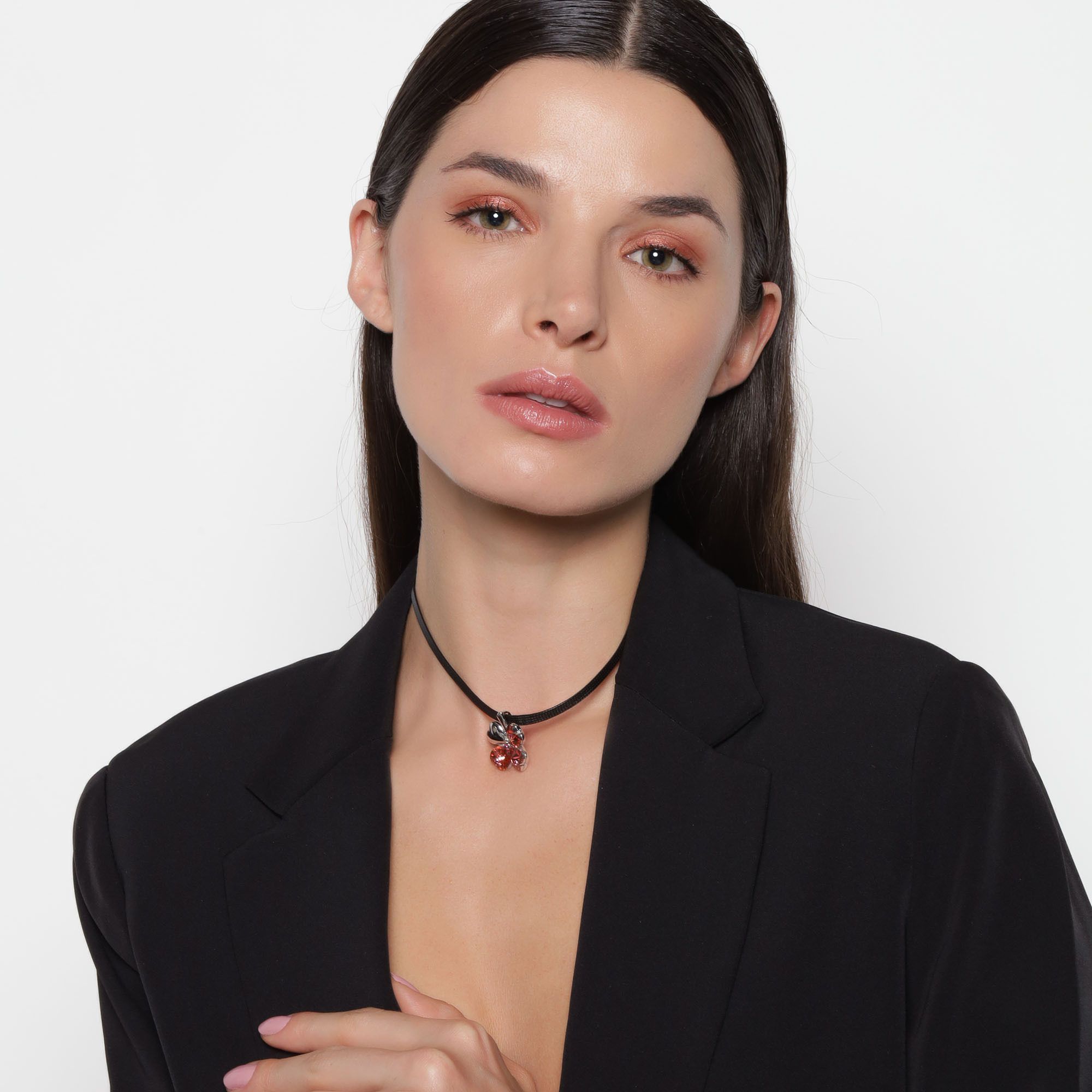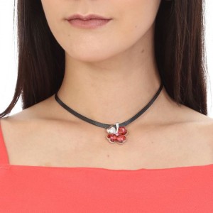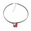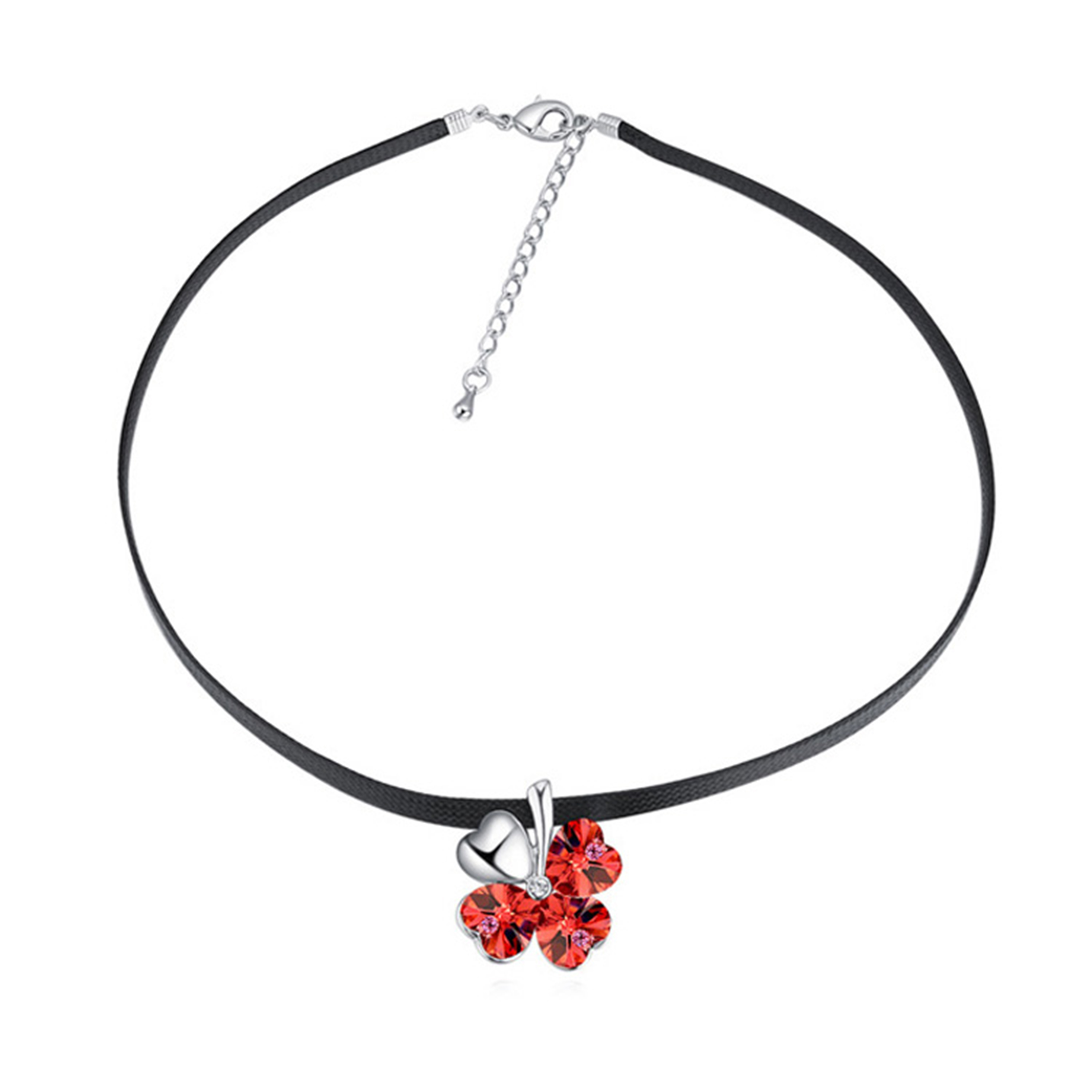 Original gargantilla de cuero negro, dije en forma de trébol con detalles de baño de oro blanco de 18 quilates y cristales en color rojo y blanco. Fabricado en una estructura de aleación de platino con rodio sin níquel.