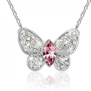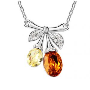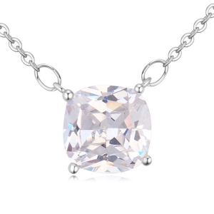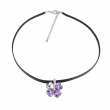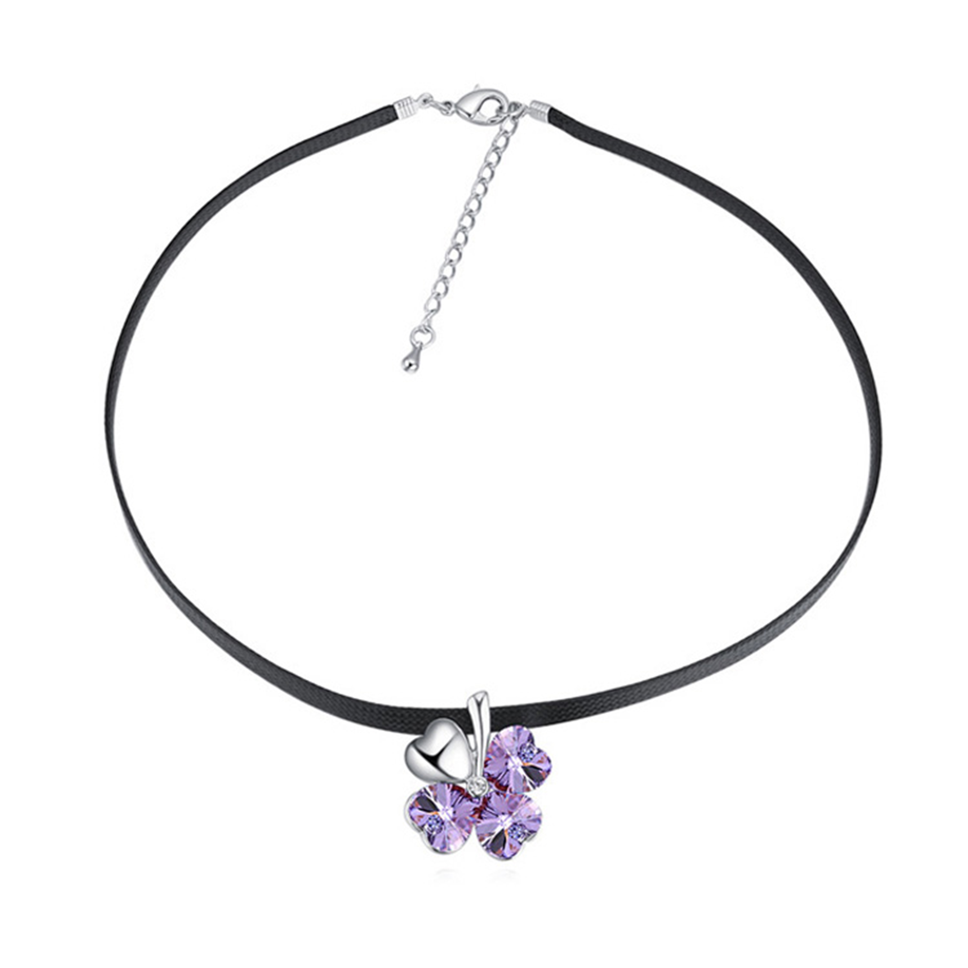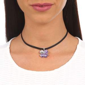 Original gargantilla de cuero negro, dije en forma de trébol con detalles de baño de oro blanco de 18 quilates y cristales en color morado y blanco. Fabricado en una estructura de aleación de platino con rodio sin níquel.