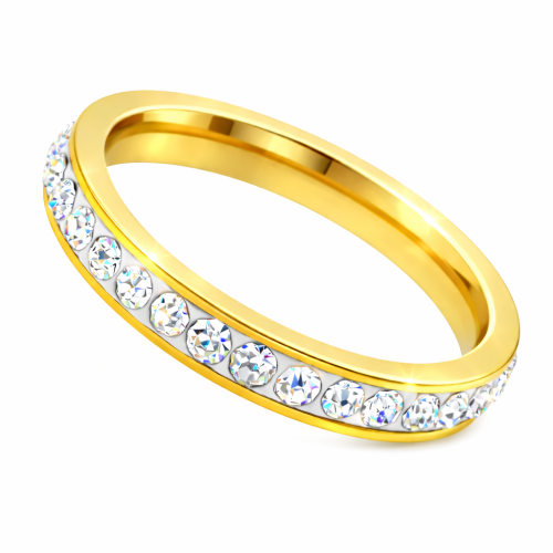 Anillo de acero inoxidable en color amarillo, fino diseño, con fondo blanco e incrustaciones de cristales blancos.