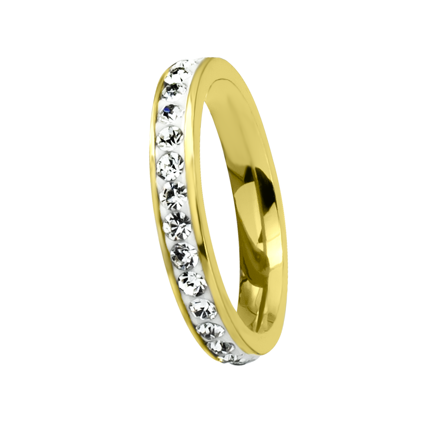 Anillo de acero inoxidable en color amarillo, fino diseño, con fondo blanco e incrustaciones de cristales blancos.