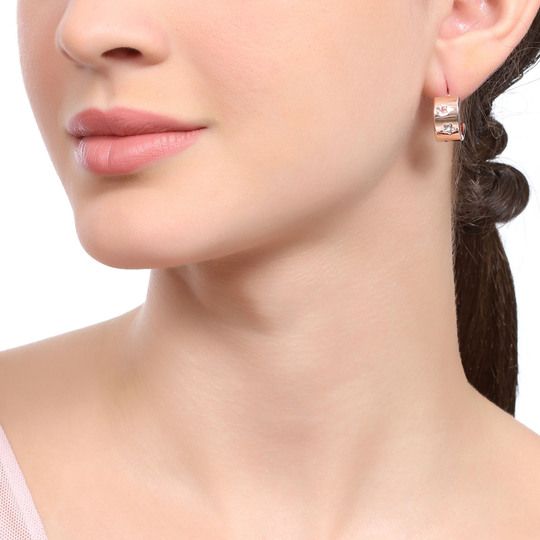 Aretes en baño de oro rosa de 18 quilates, diseño grabado de estrellas con incrustaciones de cristales en colores. Fabricado en una estructura de aleación de platino con rodio sin níquel.
