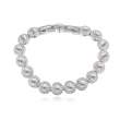 Linda pulsera en baño de oro blanco de 18 quilates , diseño con incrustaciones de cristales en color blanco. Fabricado en una estructura de aleacion de platino con rodio sin niquel. 1. Joyeria Hipo alergenica. 2. Incluye cajita de Joyeria. 3. Garantia de 30 dias por defectos de fabrica.