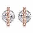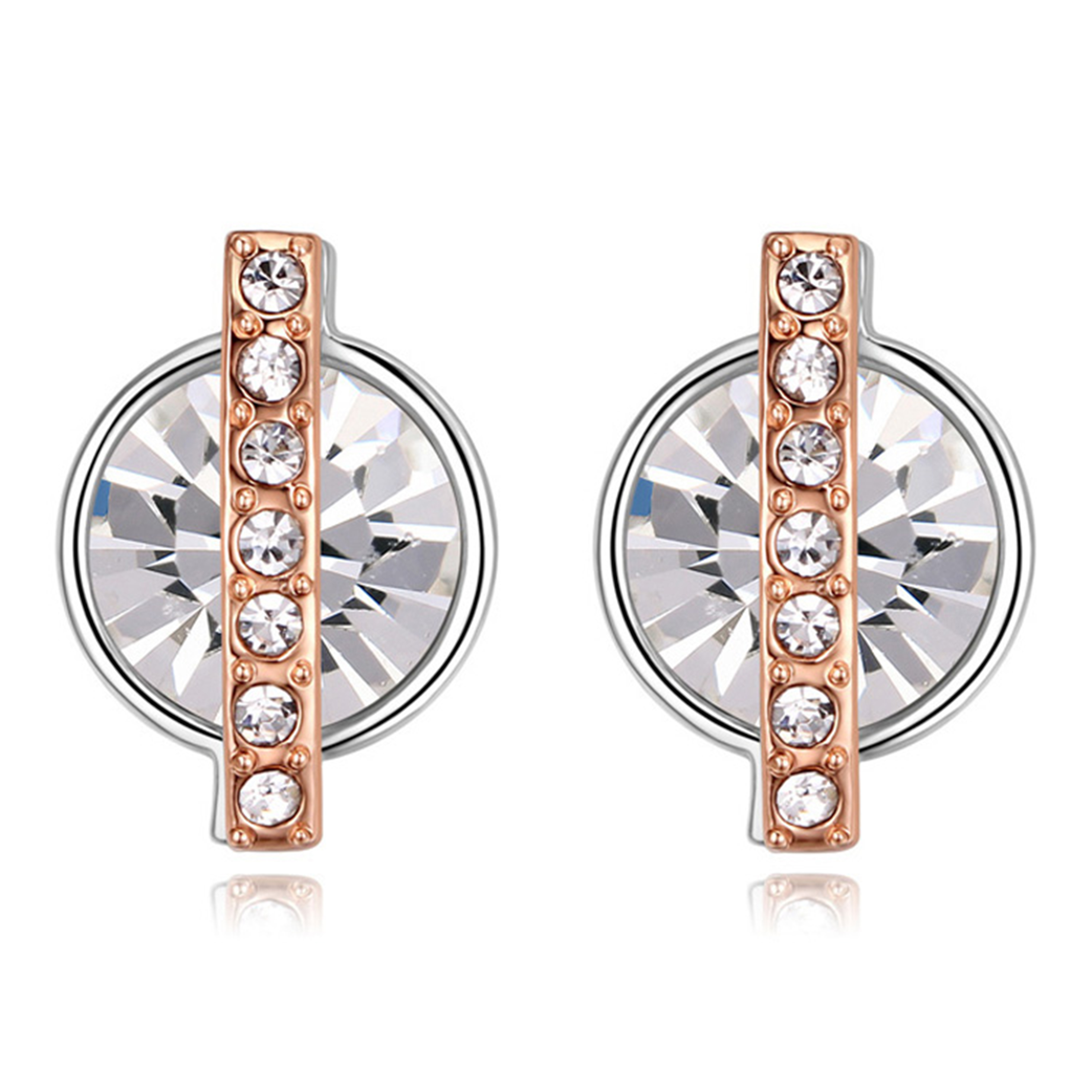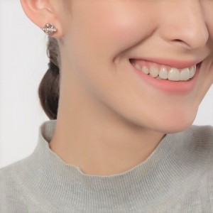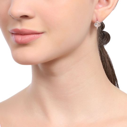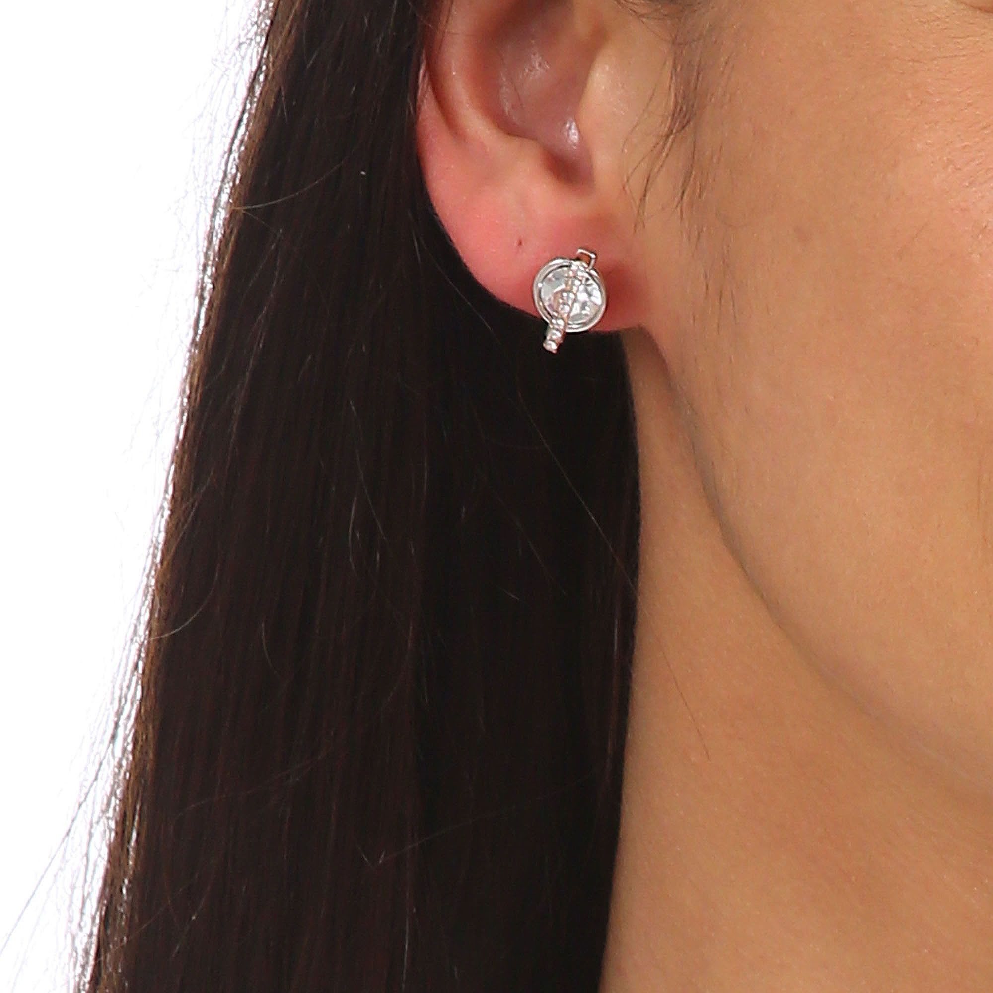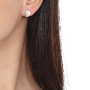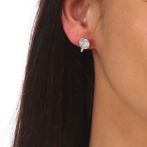Finos aretes en baño de oro blanco de 18 quilates , con cristal blanco corte brillante e incrustaciones de cristales en color blanco. Fabricado en una estructura de aleación de platino con rodio sin níquel.