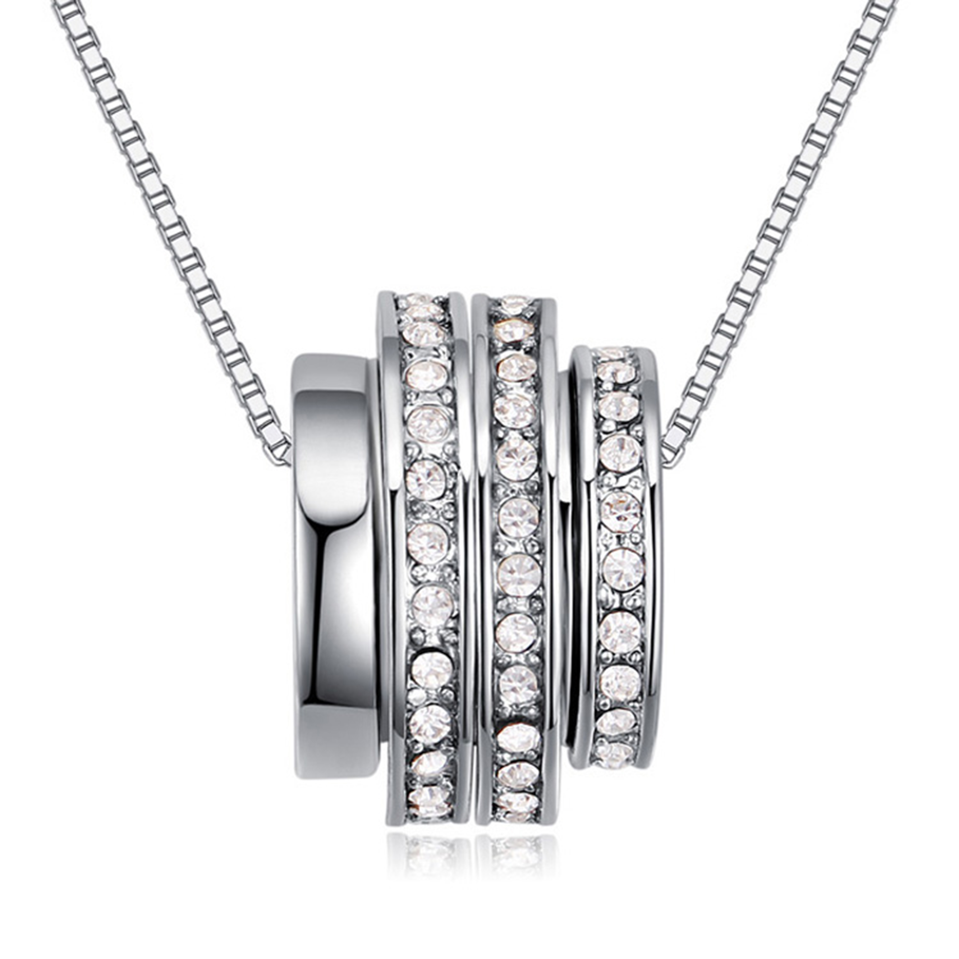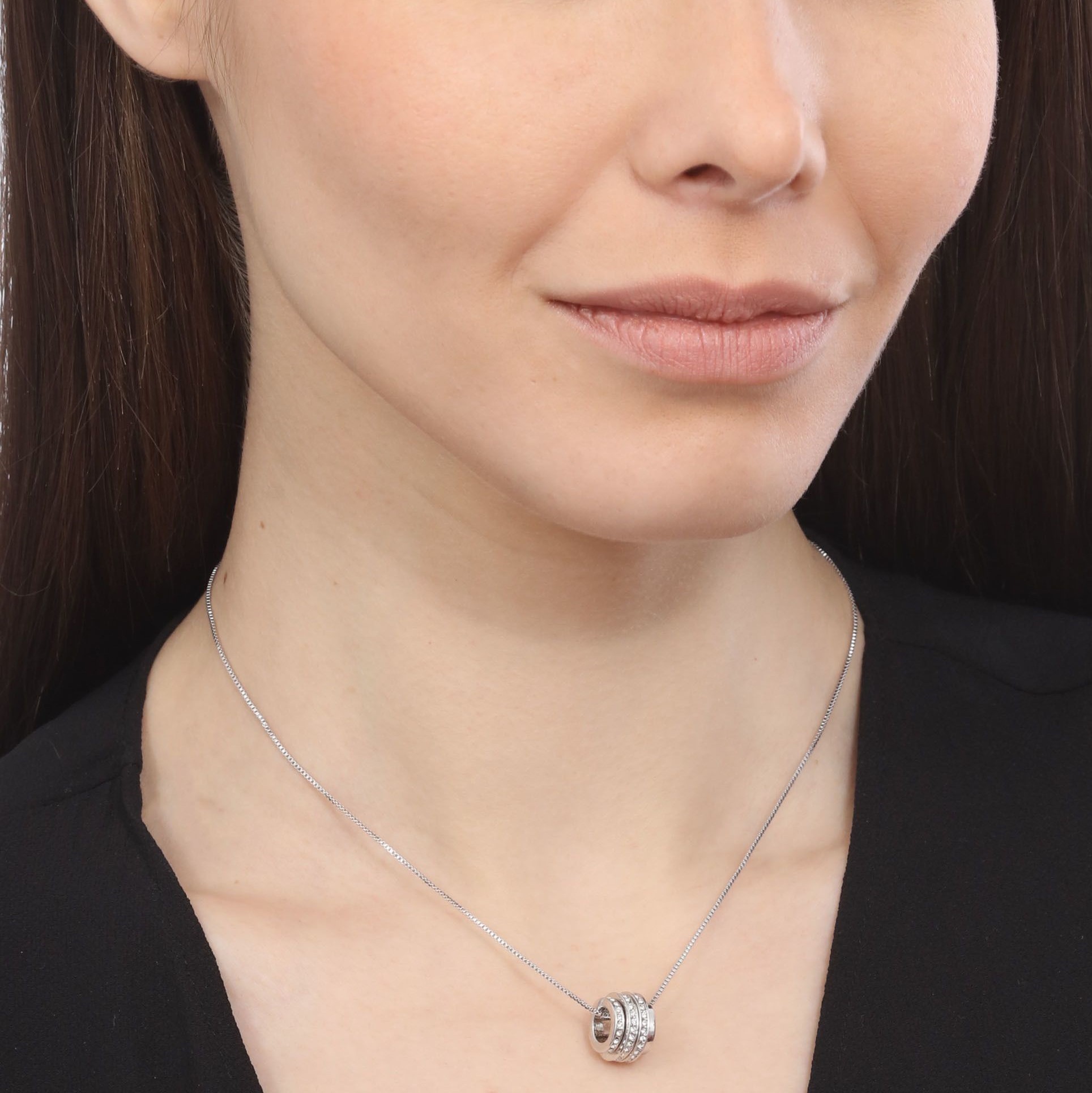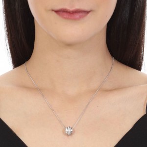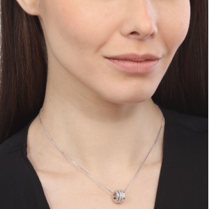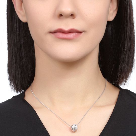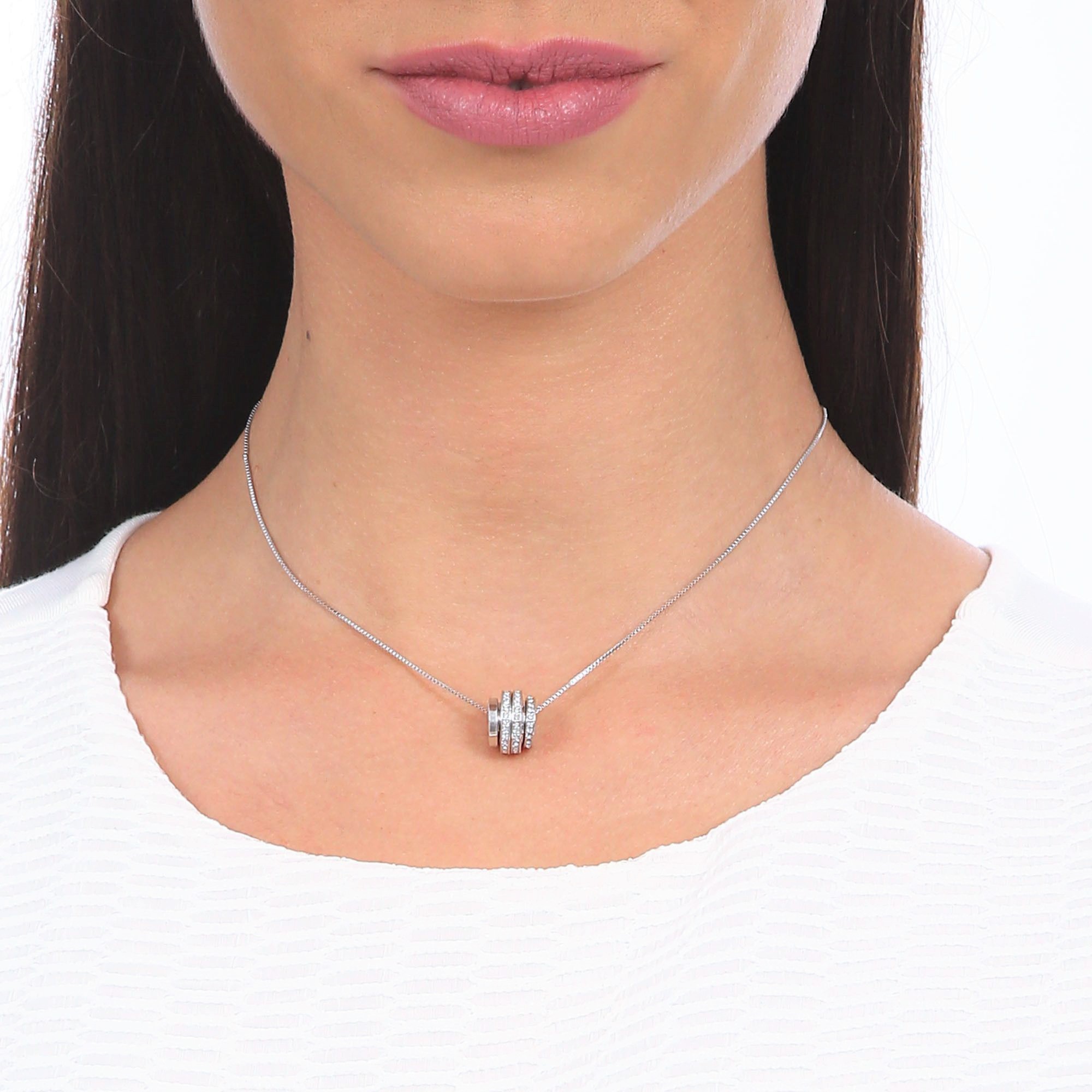 Dije con cadena en baño de oro blanco de 18 quilates, fino diseño de aros con incrustaciones de cristales en color blanco. Fabricado en una estructura de aleación de platino con rodio sin níquel.