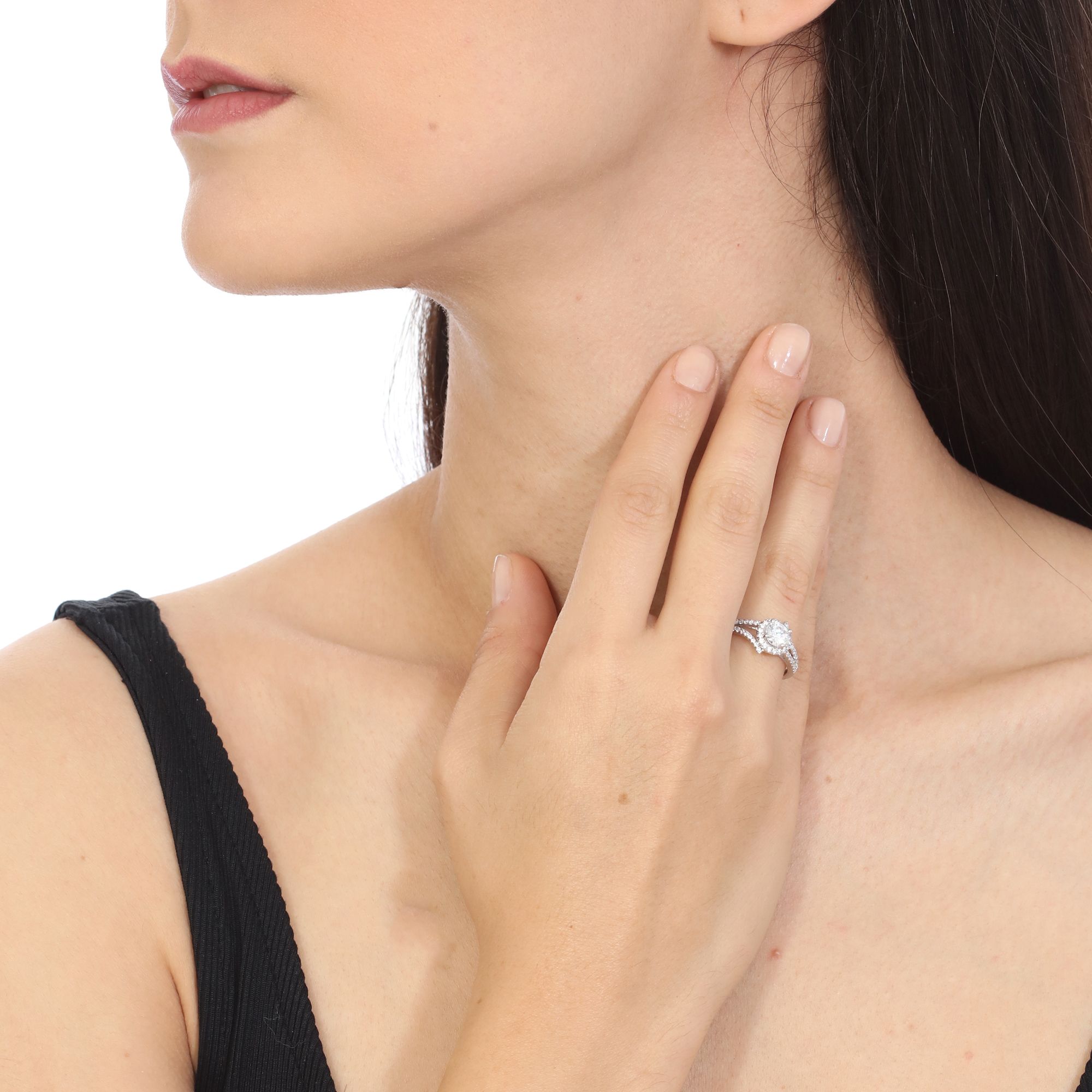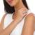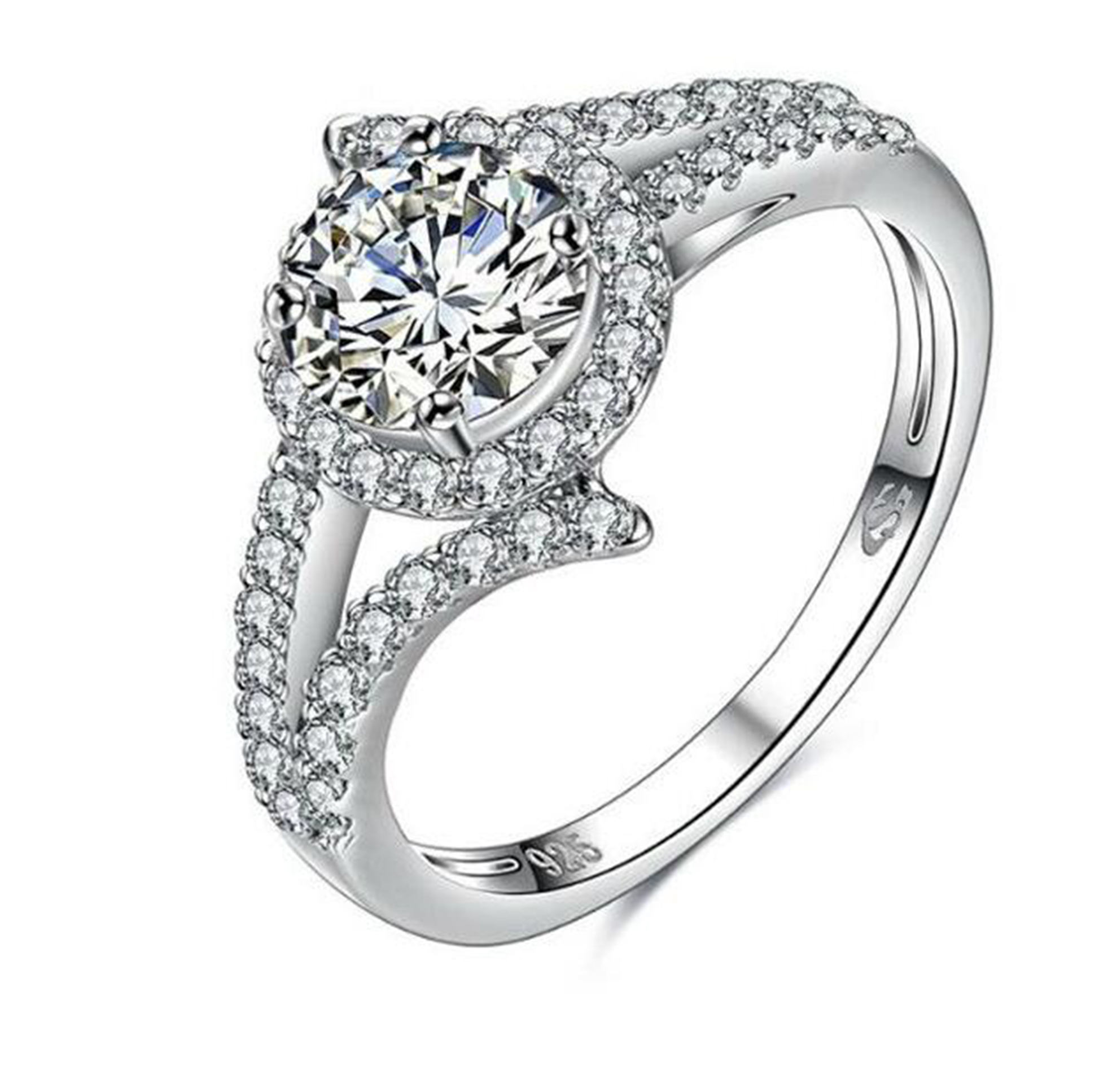 Precioso anillo, en baño de oro blanco de 18 quilates, fino diseño, con cristal blanco corte brillante, detalles en plateado e incrustaciones de cristales blancos. Fabricado en una estructura de aleación de platino con rodio sin níquel.