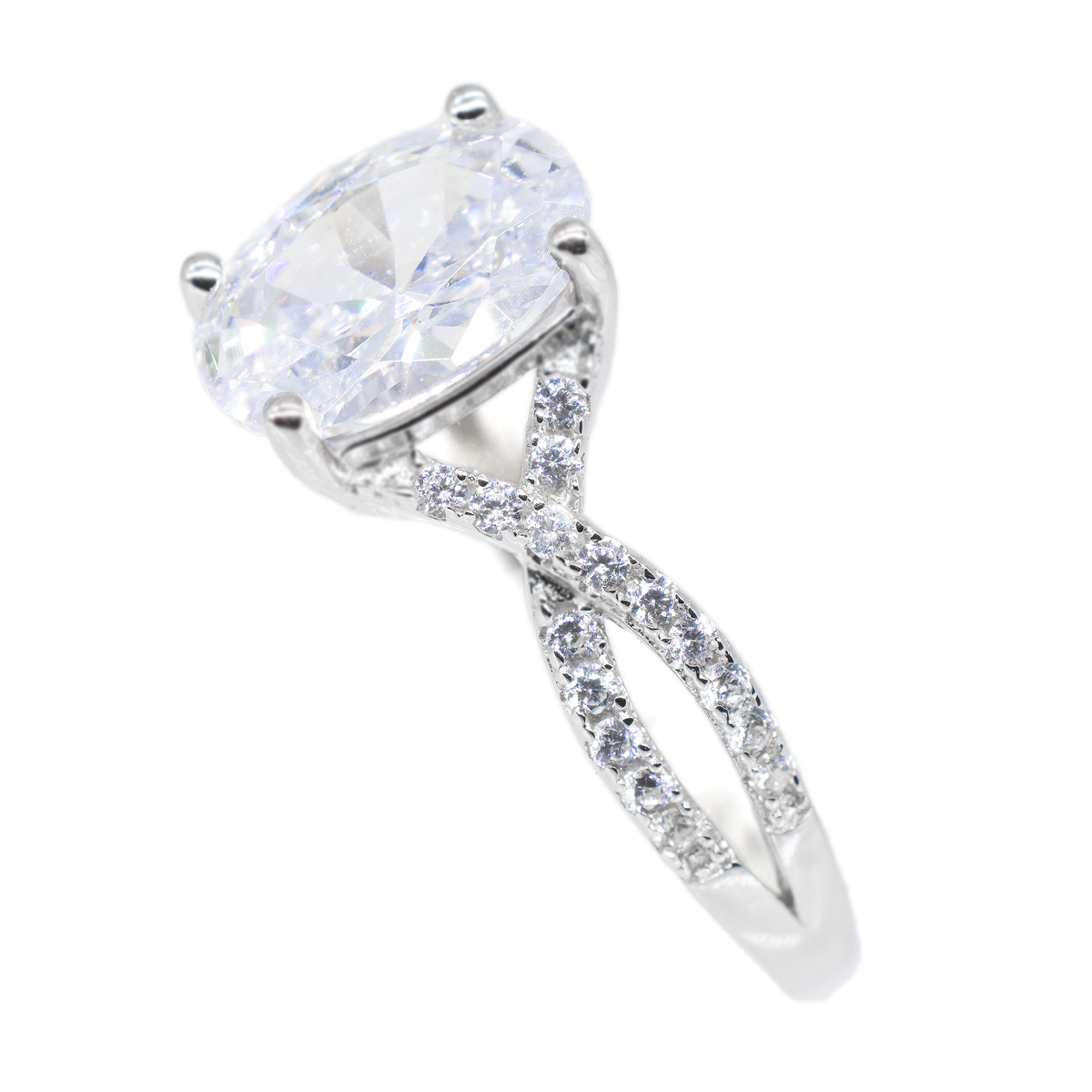 Precioso anillo en baño de oro blanco de 18 quilates, fino diseño entrelazado, con cristal blanco corte oval e incrustaciones de cristales blancos. Fabricado en una estructura de aleación de platino con rodio sin níquel.