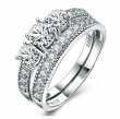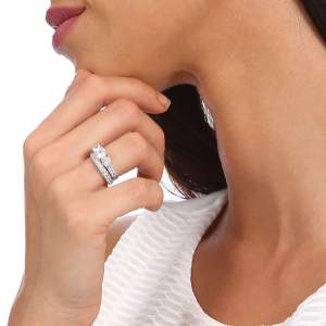Precioso anillo doble en baño de oro blanco de 18 quilates, fino diseño, con tres cristales blancos corte brillante e incrustaciones de cristales blancos. Fabricado en una estructura de aleación de platino con rodio sin níquel.