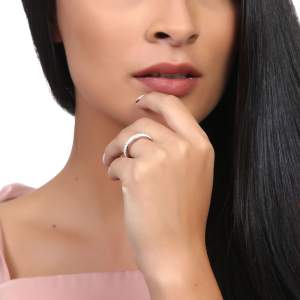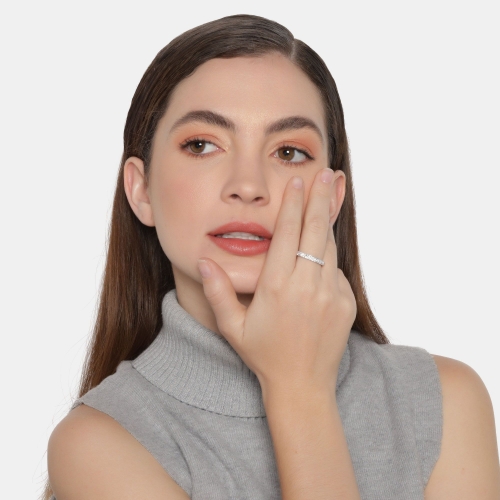 Precioso anillo en baño de oro blanco de 18 quilates, fino diseño, con fondo blanco e incrustaciones de cristales en color blanco. Fabricado en una estructura de aleación de platino con rodio sin níquel.