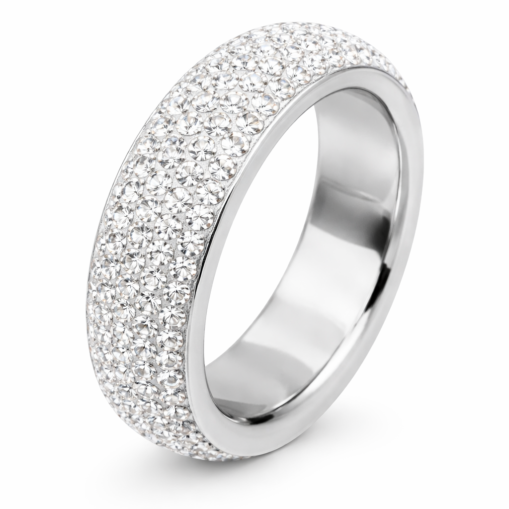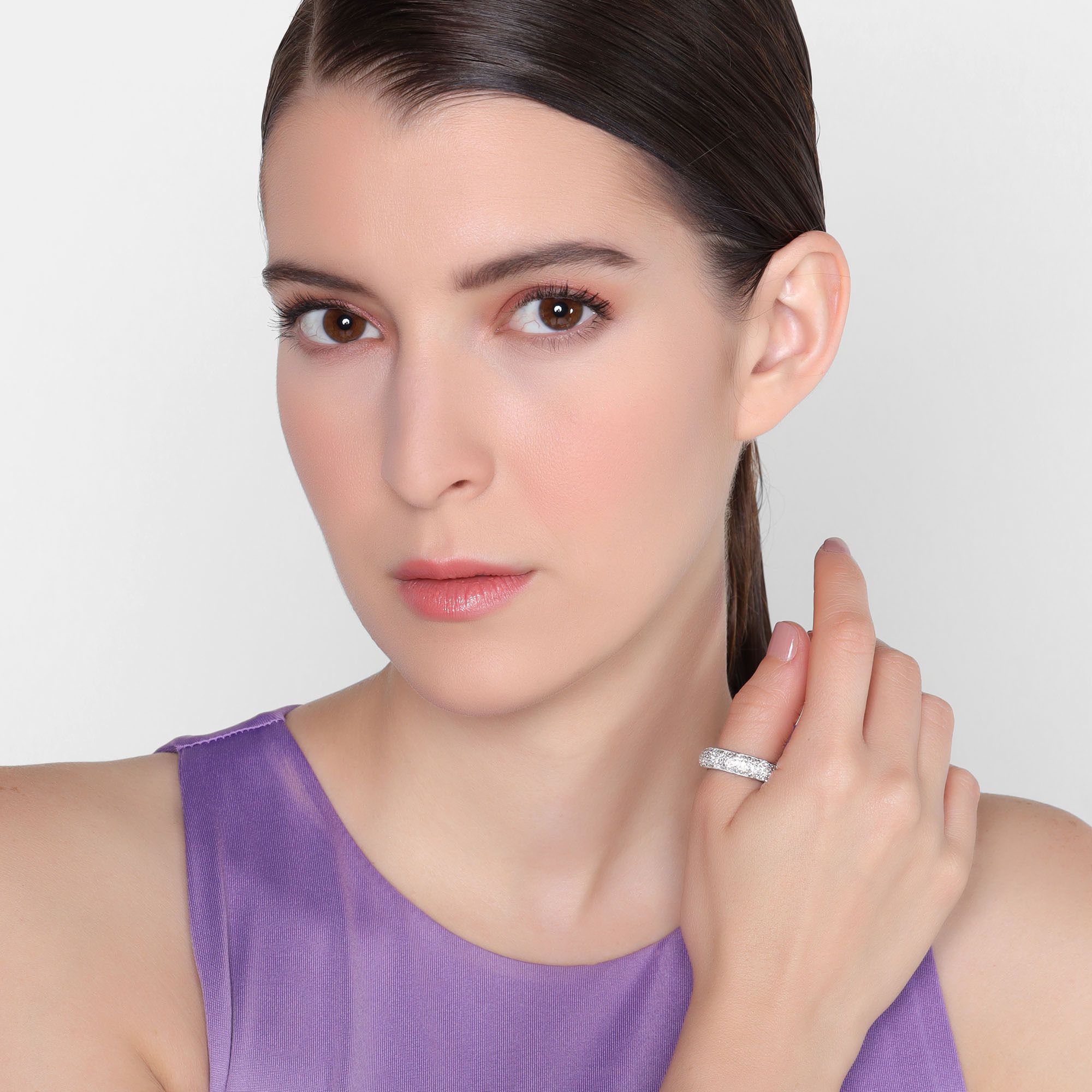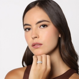Anillo en baño de oro blanco de 18 quilates, fino diseño con incrustaciones de cristales en color blanco. Fabricado en una estructura de aleación de platino con rodio sin níquel.