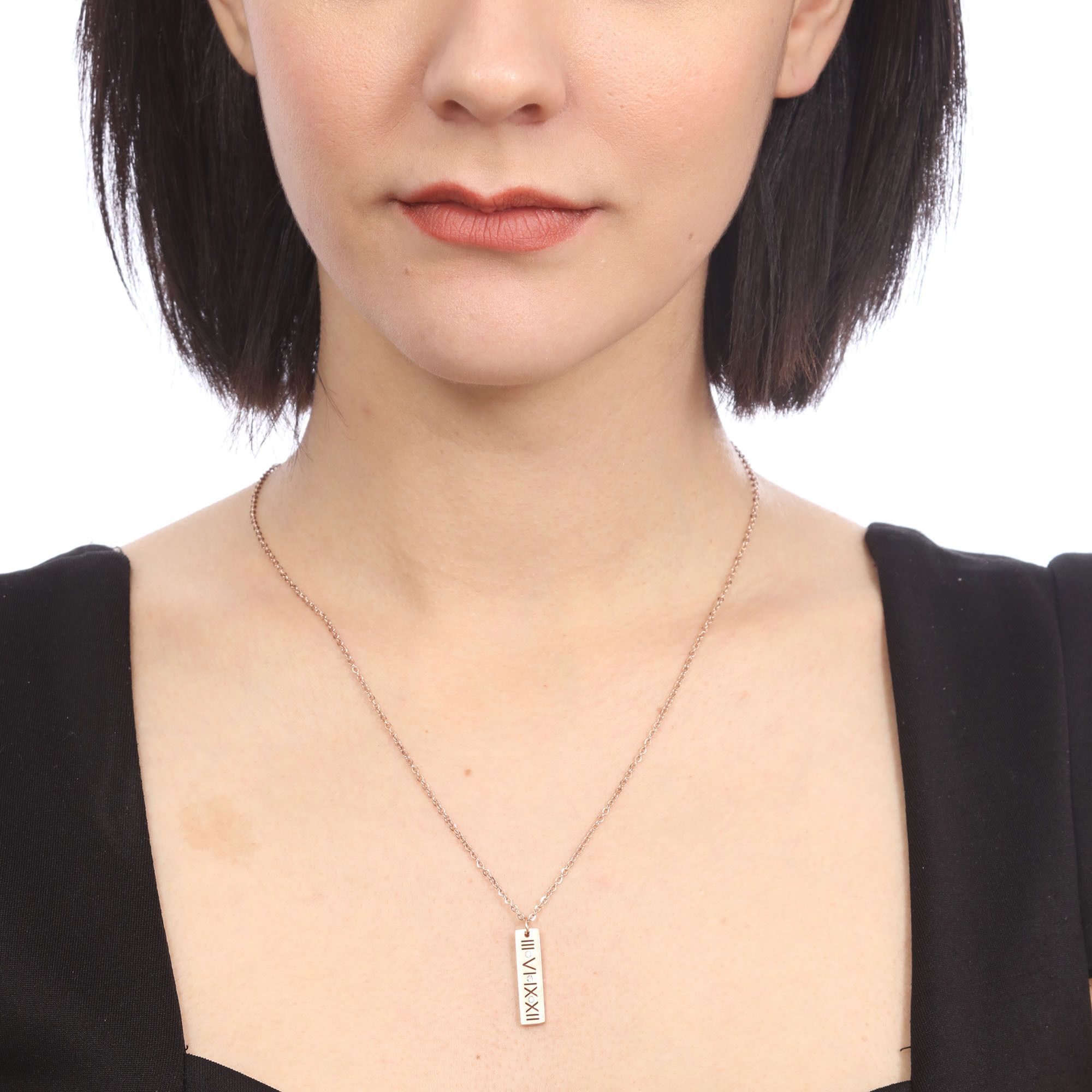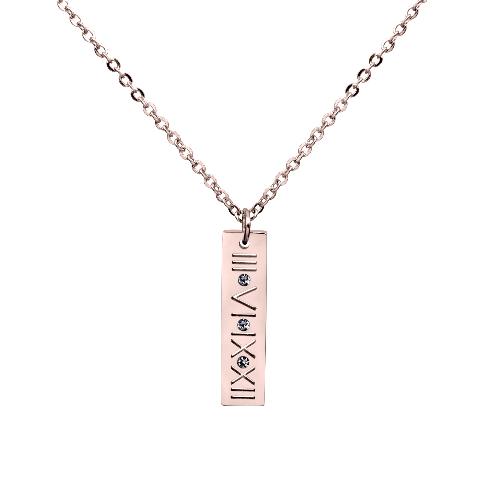 Dije con cadena de acero inoxidable en color rosa, con grabado de número romanos e incrustaciones de cristales blancos.