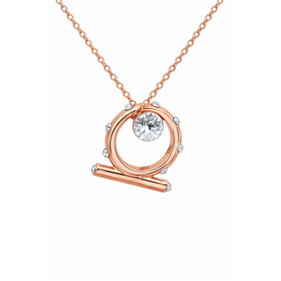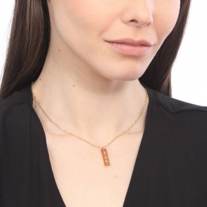Dije con cadena de acero inoxidable en color amarillo, con grabado en números romanos e incrustaciones de cristales blancos.